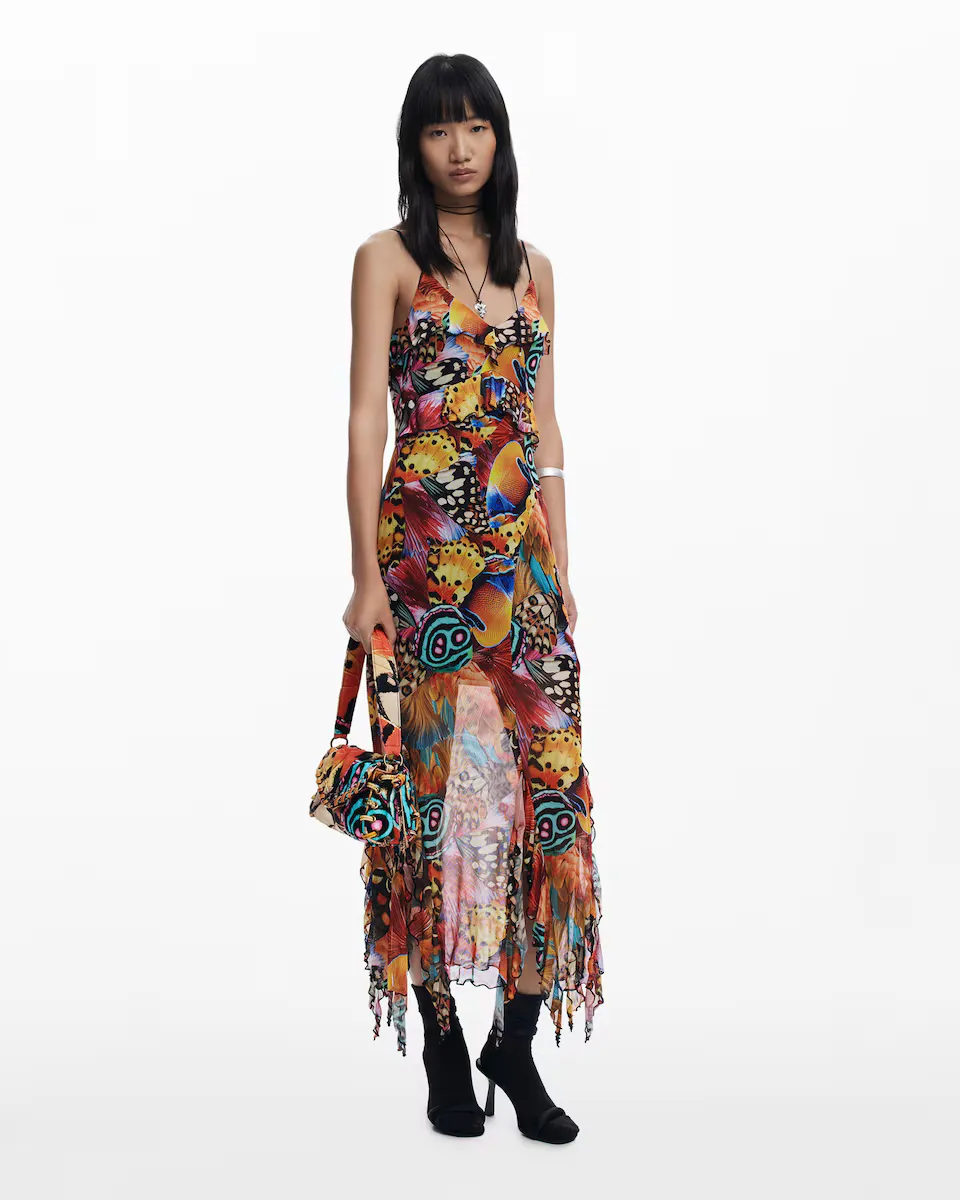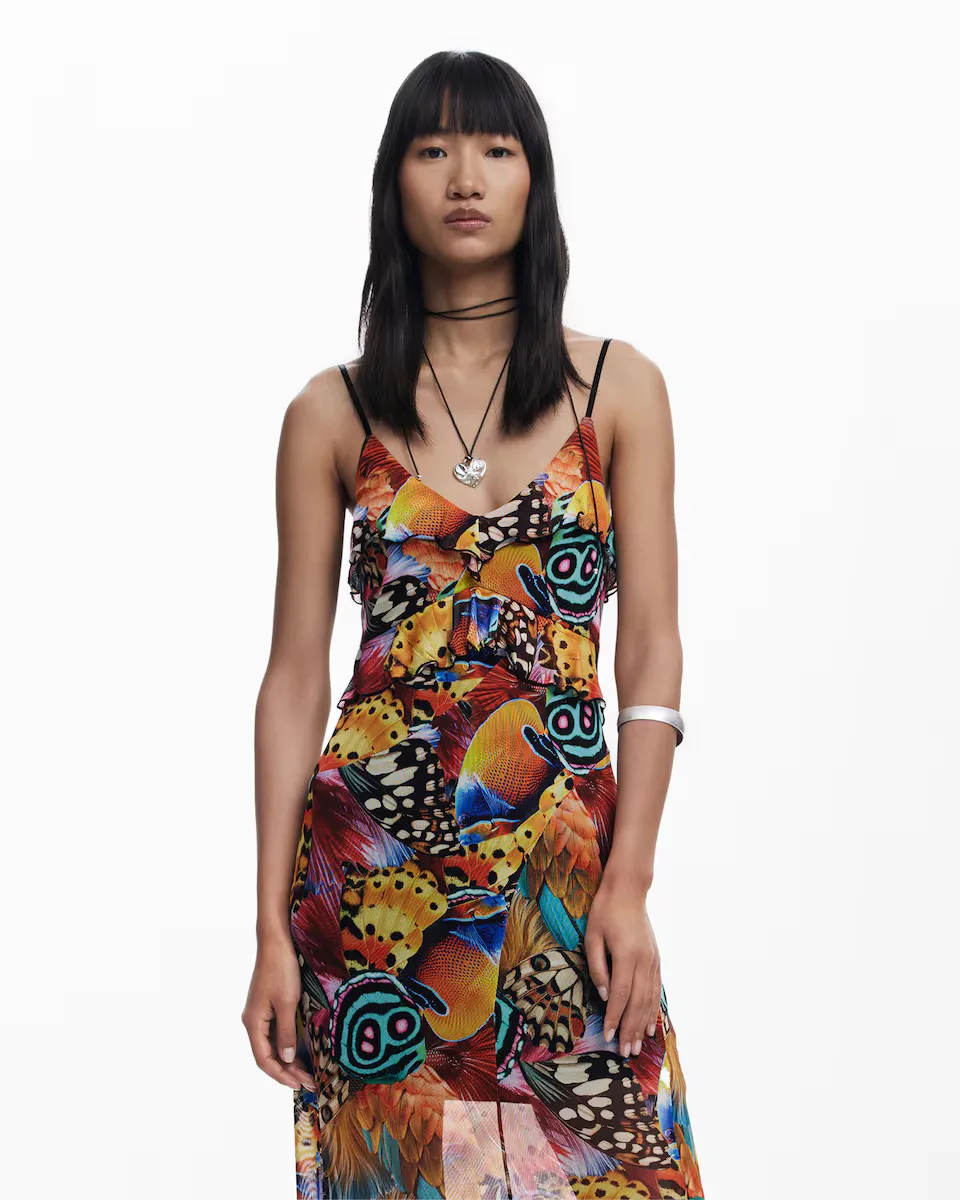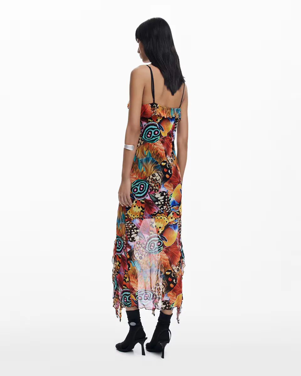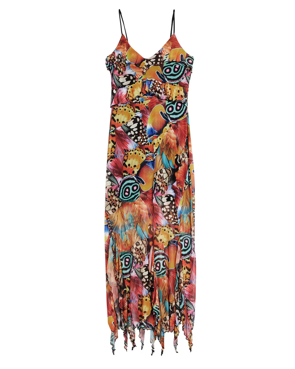 Платье миди, облегающее из тюля с короткой подкладкой, V-образным вырезом с воланами, тонкими бретелями, асимметричными воланами по низу и рисунком бабочек и перьев, разработанным Месье Кристианом Лакруа. Крой: Slim. Длина: Миди. Вырез: в форме V. На бретелях. Детали с асимметричными воланами. Разработано: мистер Кристиан Лакруа. Переработанный полиэстер.