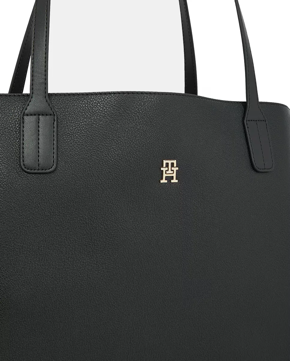Сумка-тоут для женщин, изготовленная из экокожи черного цвета. Дизайн с внутренним несессером на молнии и металлическим логотипом Tommy Hilfiger на передней части.