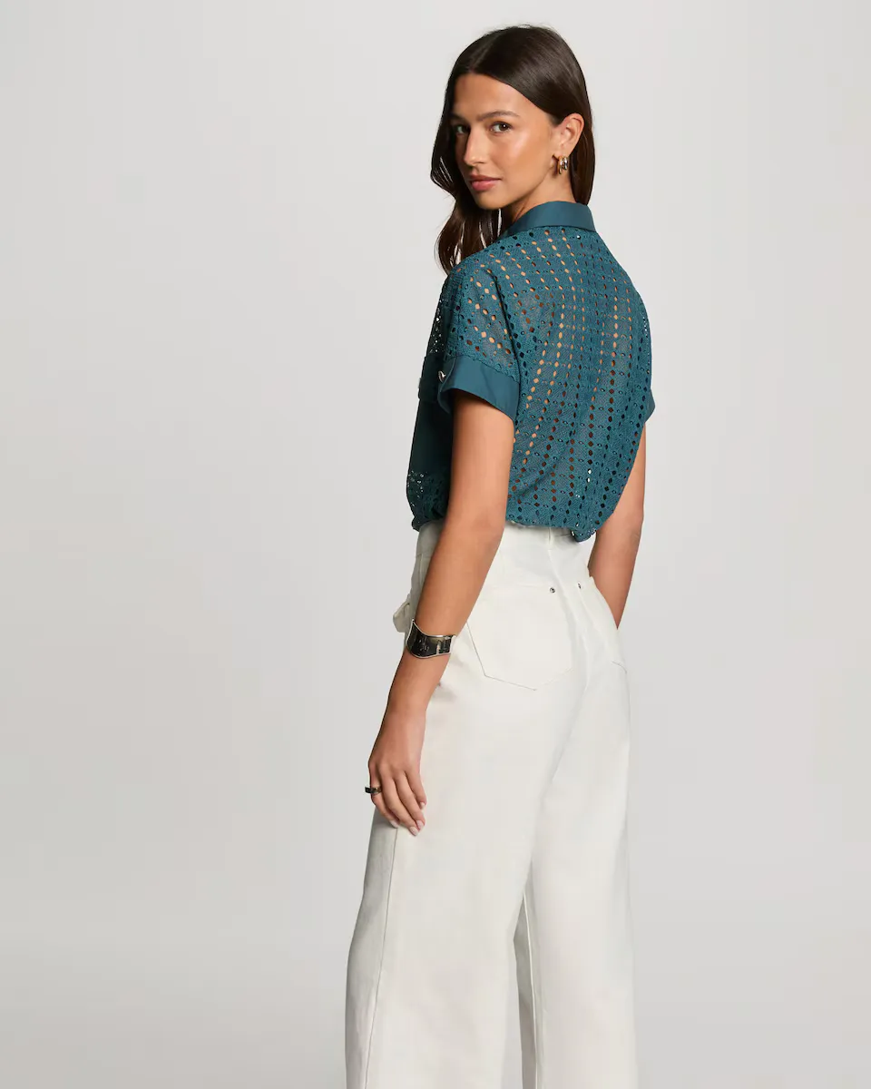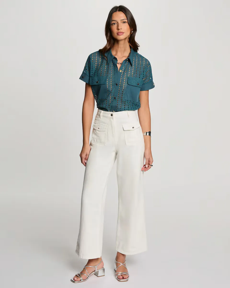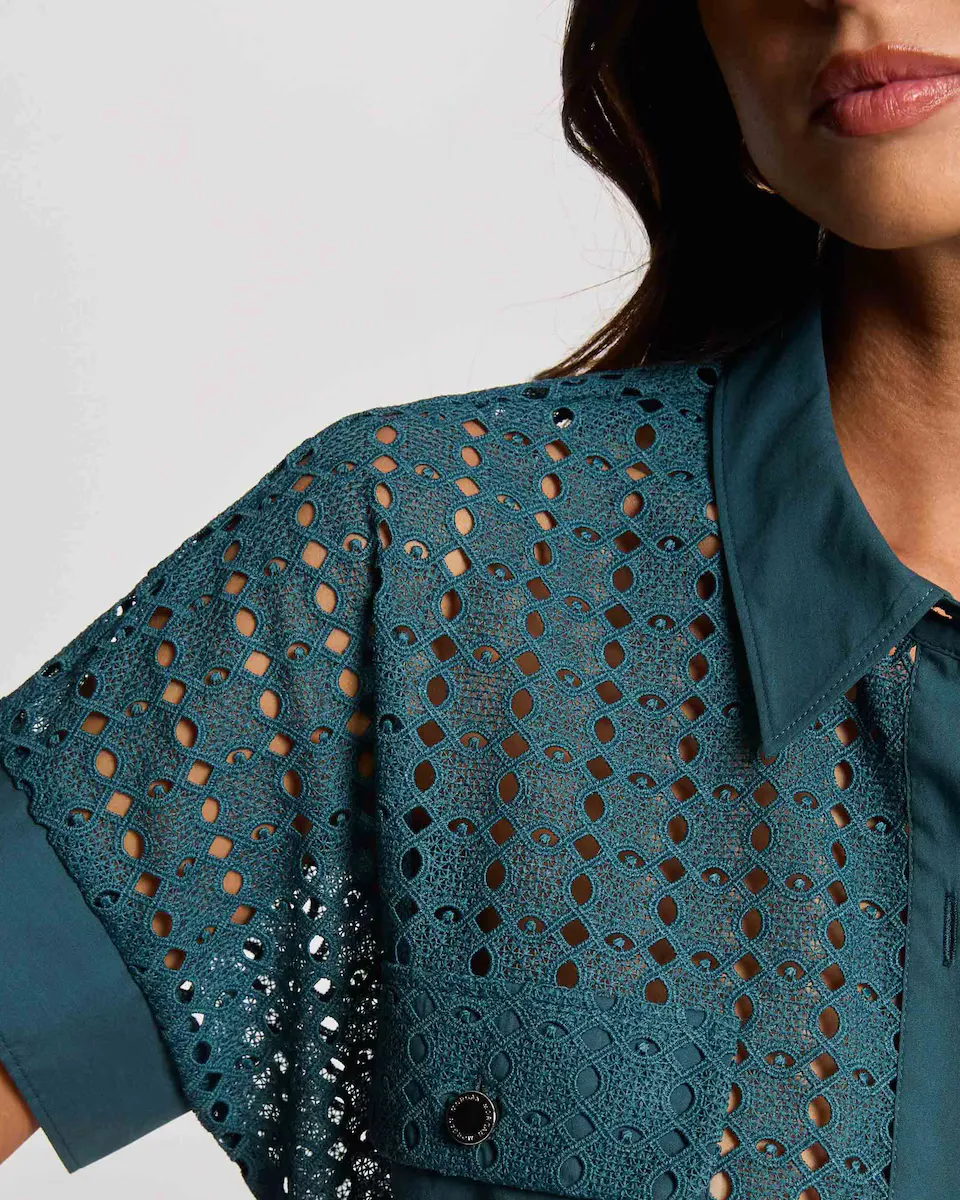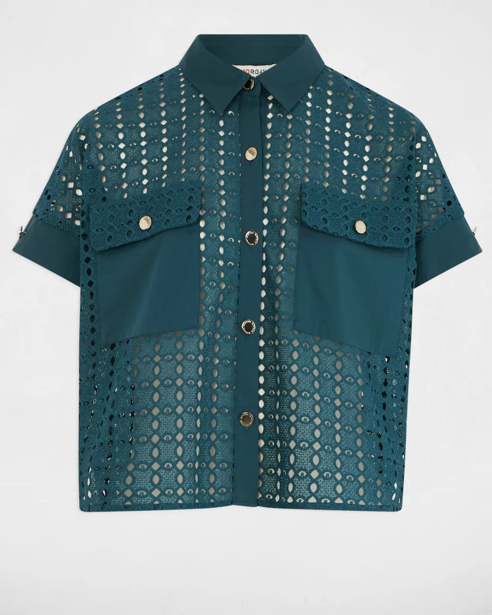 Рубашка с коротким рукавом. Прямой крой. Воротник с лацканами. Короткие рукава. Застежка на пуговицы спереди, 2 грудных кармана с клапанами, закрывающимися на пуговицы. Эффект кружева гипюр.