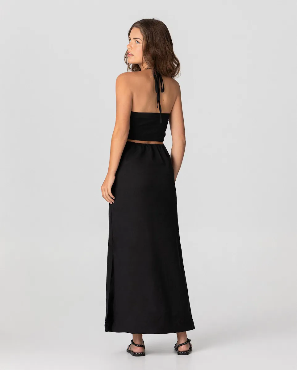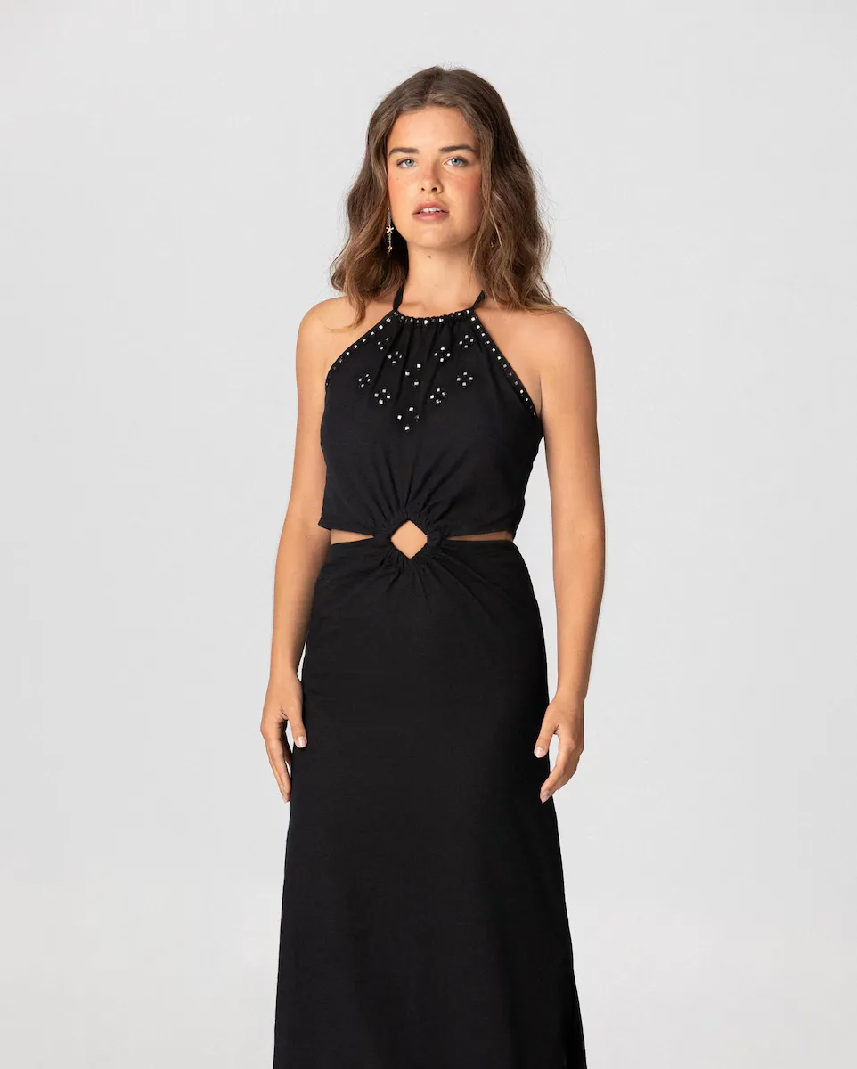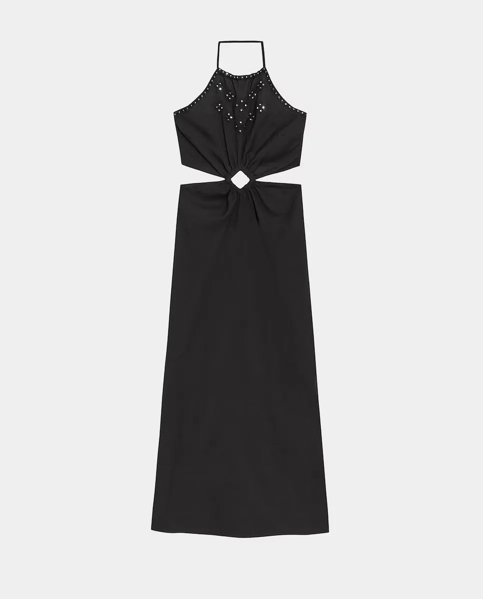 Длинное черное платье без рукавов. С боковыми и фронтальными разрезами, которые придают молодежный и современный вид, и блестящими деталями, которые поднимают дизайн. Сделай его необходимым базовым элементом своего гардероба в этот сезон. Не упусти его!