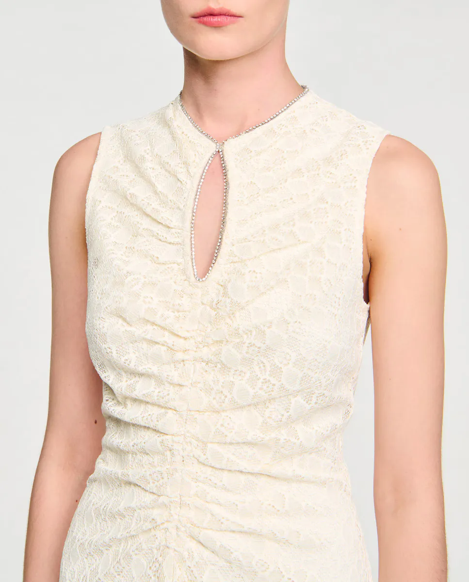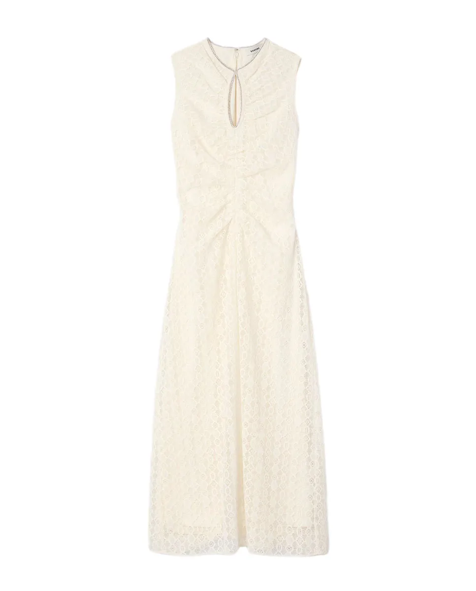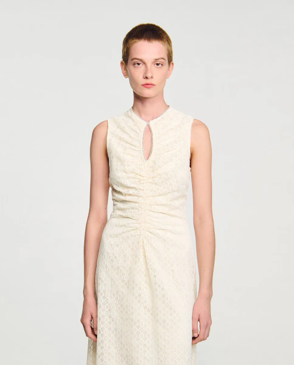 Длинное платье без рукавов из кружева, с круглым вырезом и стразами, и с разрезом в виде капли, а также расклешенной юбкой. Длинное платье Sandro для женщин. Круглый вырез с разрезом в виде капли и стразами. Без рукавов. Декор складками спереди. Расклешенная юбка. С подкладкой. Застежка на молнии сзади.