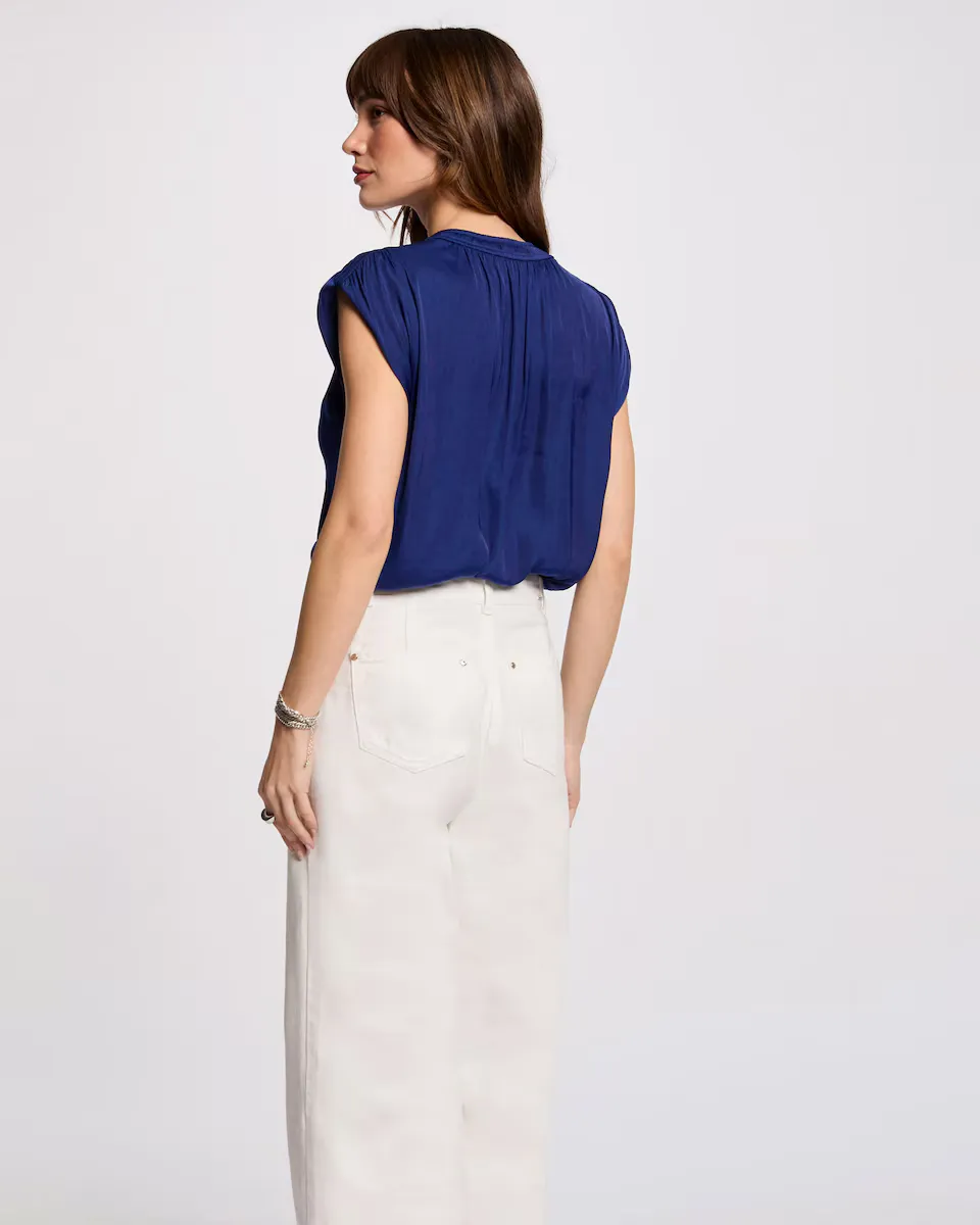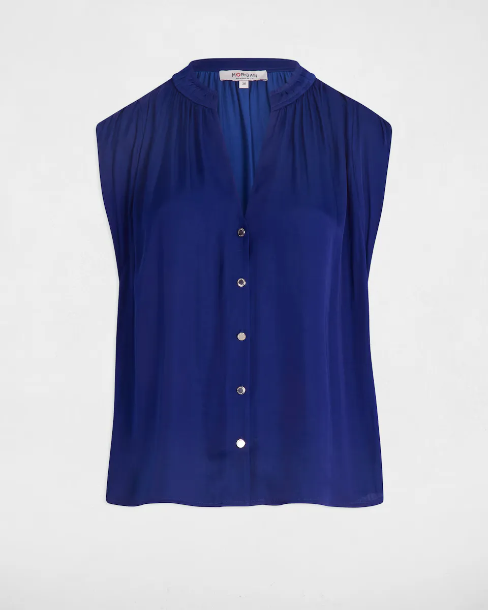 Блузка без рукавов. Прямой крой. V-образный вырез. Без рукавов. Застежка на пуговицах спереди. Эффект сатина. Сборки на плечах.