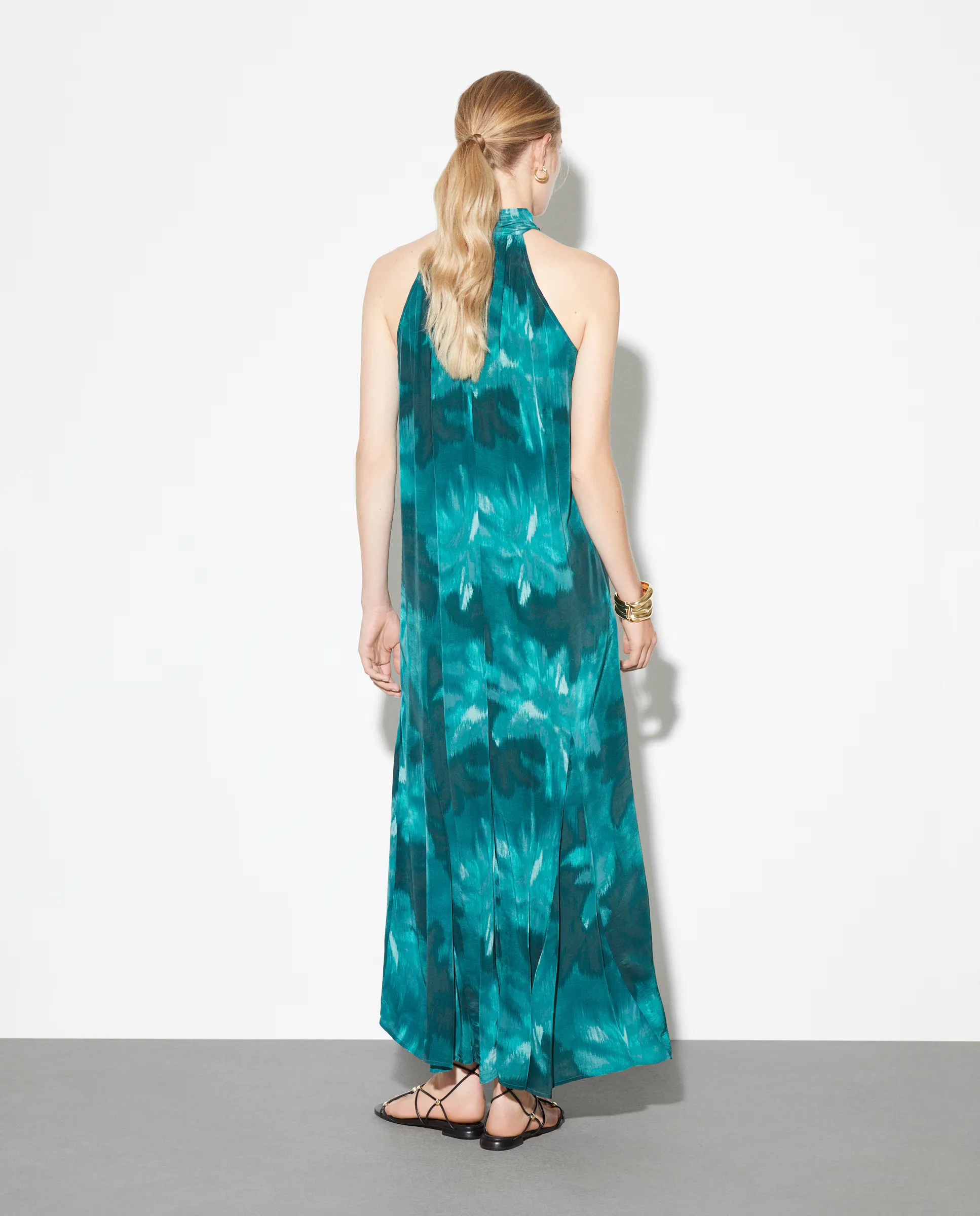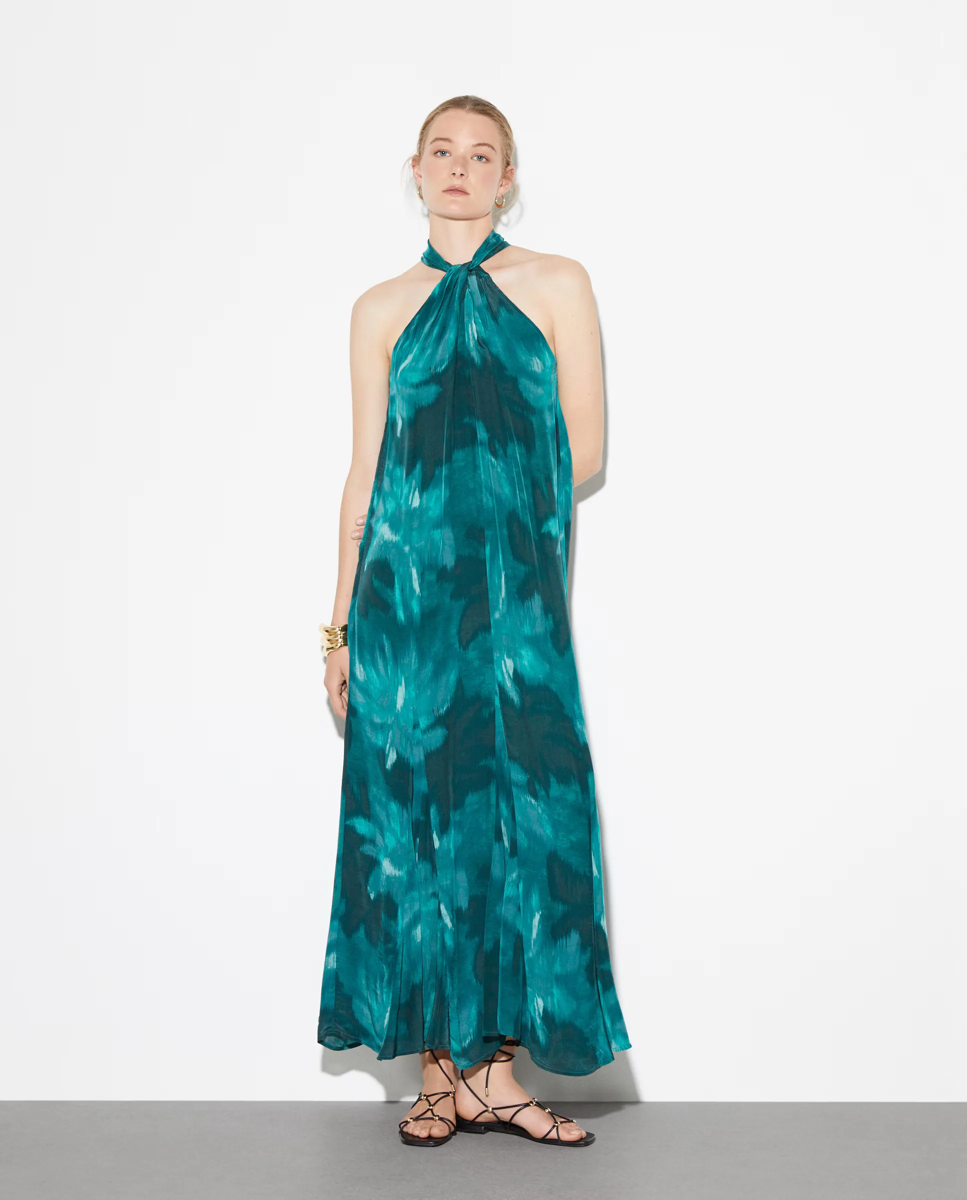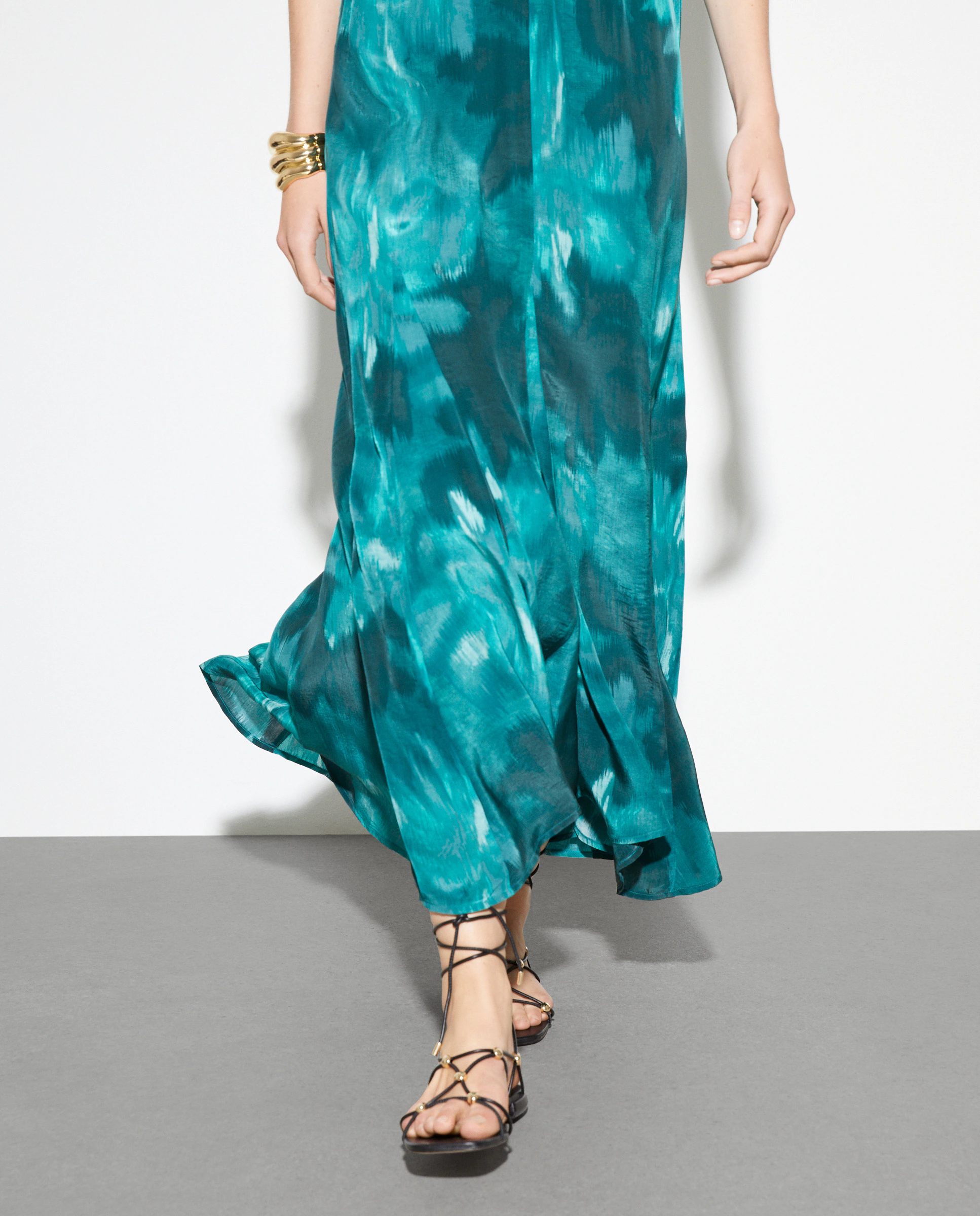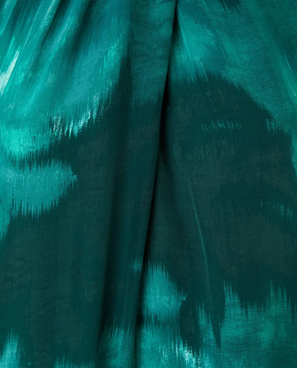 Силуэтное миди платье с коротким рукавом из шелка с геометрическим принтом.