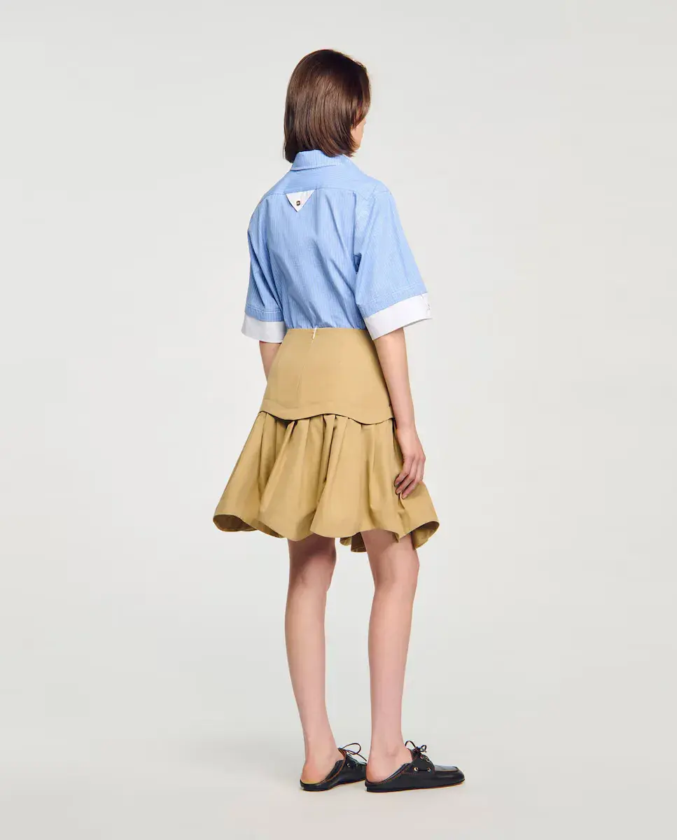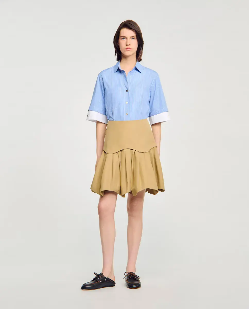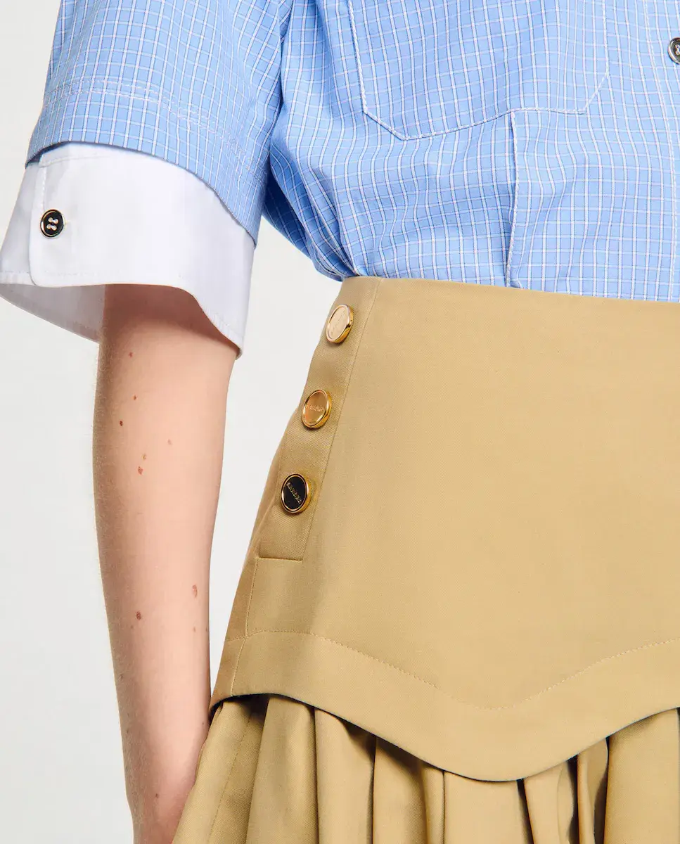 Короткая расклешенная юбка, украшенная декоративными кнопками по бокам и с объемным плиссе снизу. Короткая юбка расклешенного кроя от Sandro для женщин. Высокая талия. Декоративные кнопки. Волнистый подол. Объемные складки.