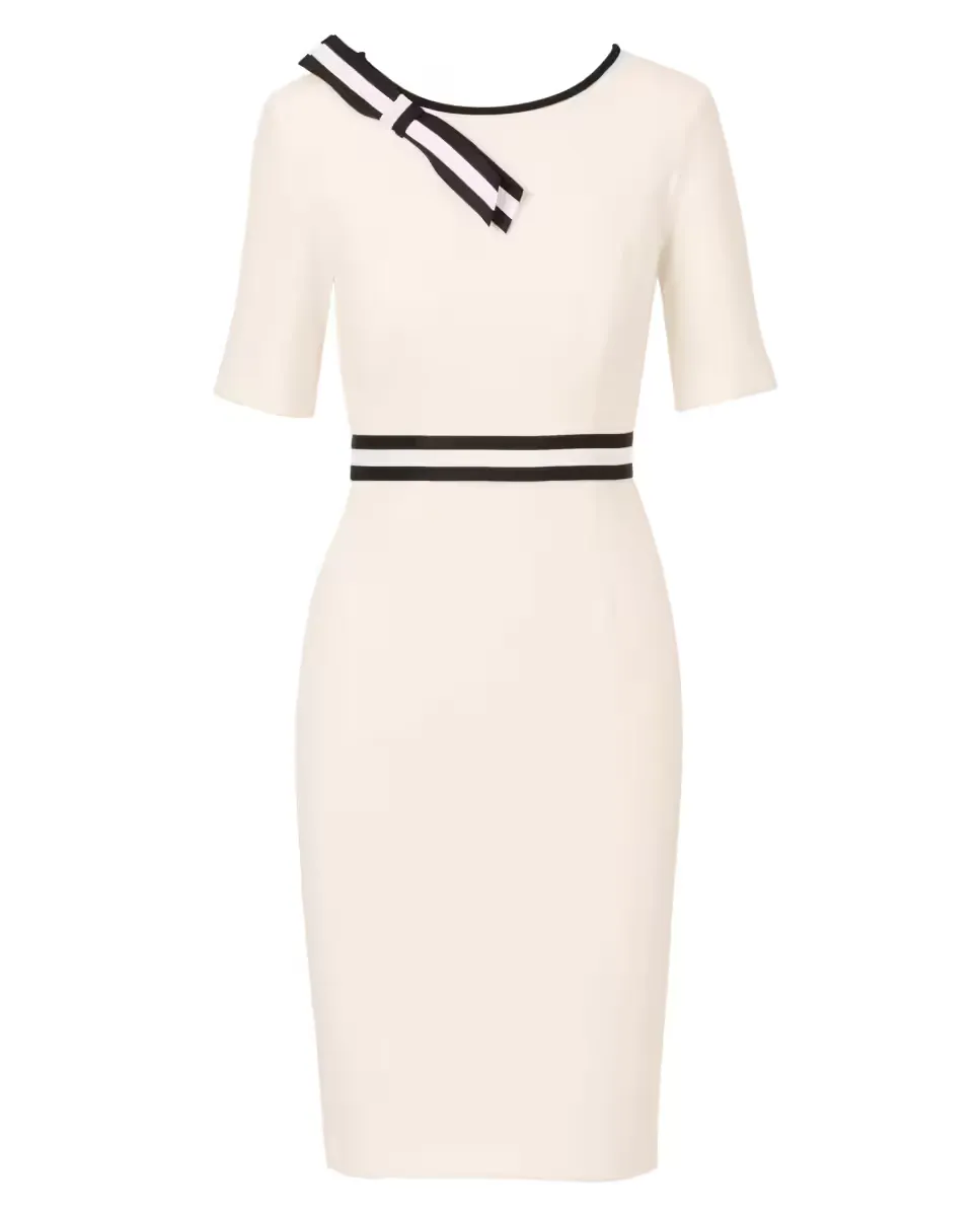 Элегантный крой этого платьяс-трубки придаёт вашему образу весёлый ретро-стиль 60-х годов. Контрастный полосатый пояс ещё больше подчеркивает силуэт, а подходящий бантик на воротнике создает красивую деталь, которая обрамляет лицо. Рукава до локтя и коктейльная длина завершают дизайн с застёжкой на молнии на спине, которая гарантирует идеальную посадку. Это элегантное платье так же хорошо смотрится в офисе, как и на воскресном бранче, придавая изысканность любой ситуации.