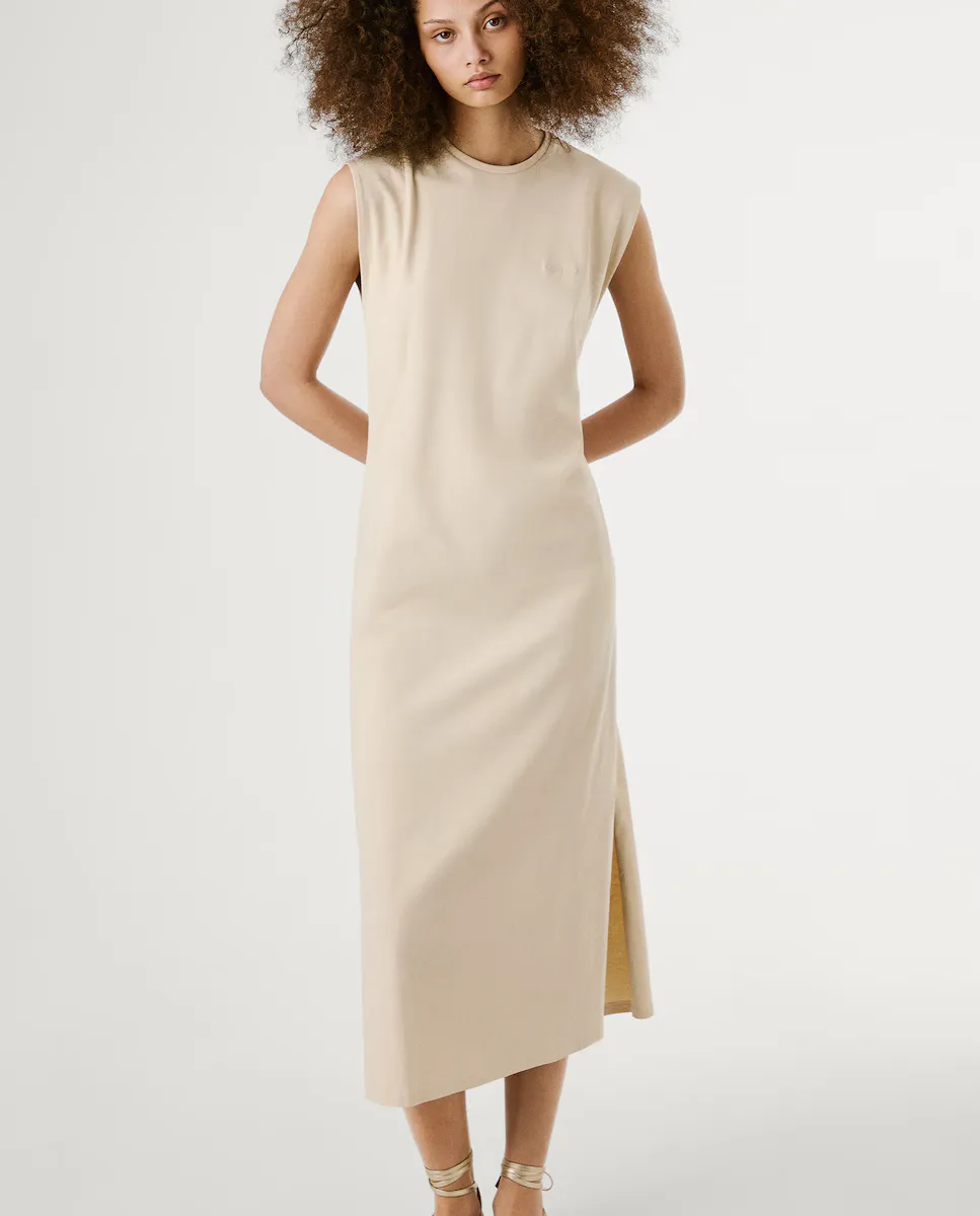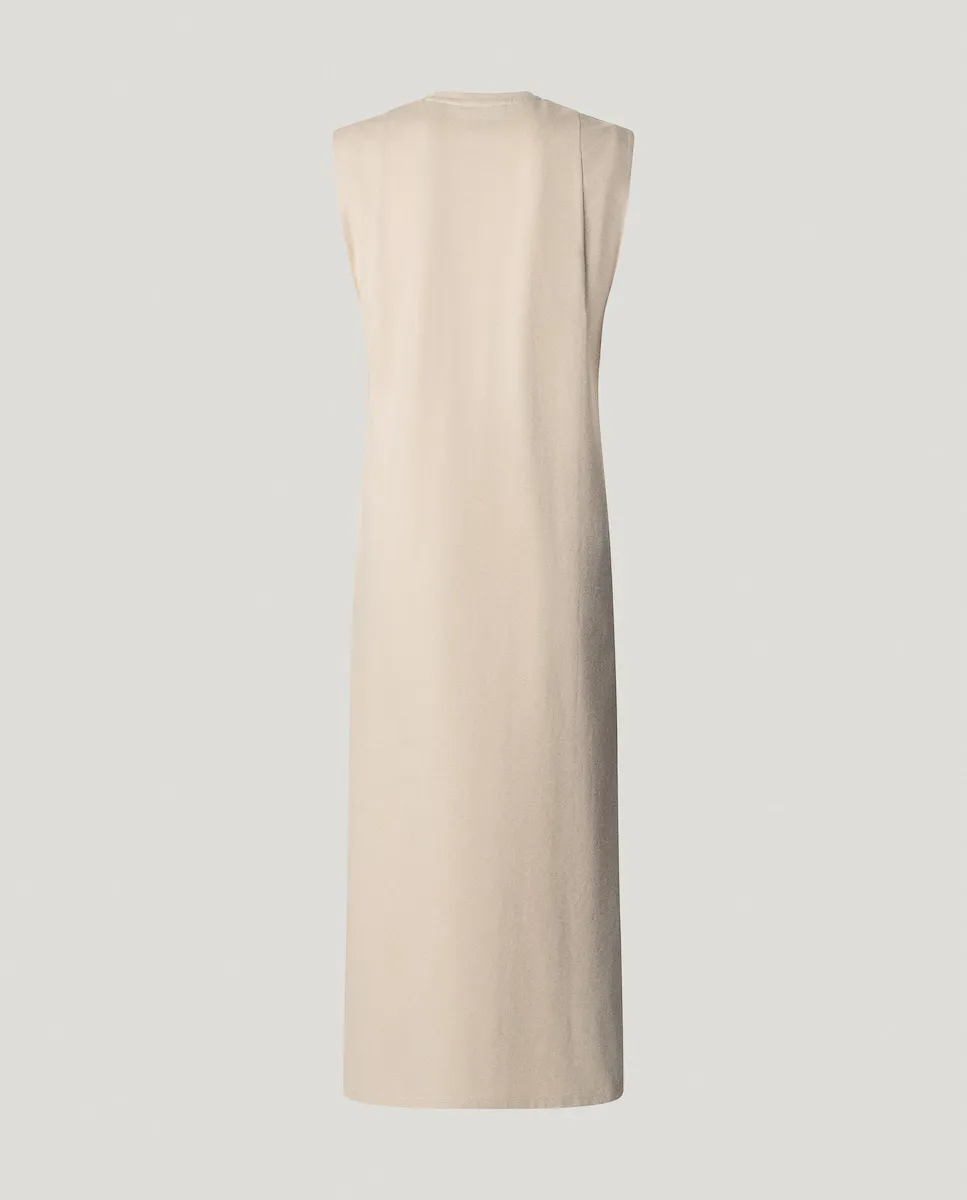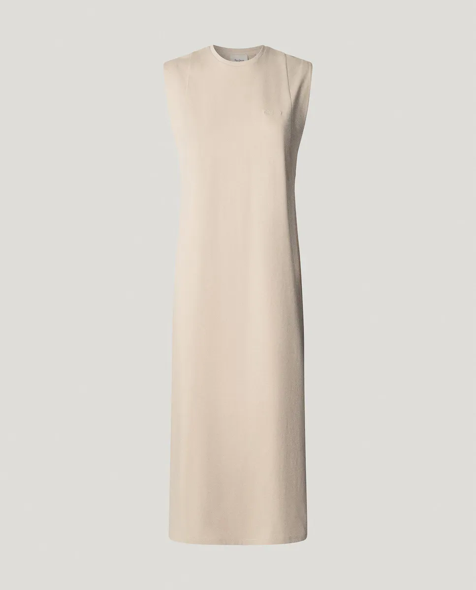 Длинное платье из трикотажа без рукавов, с двойным подолом на проймах и круглым вырезом с кантом. Вышитый логотип PEPEJEANS в тон слева на груди и отделка двойным швом внизу. Изготовлено на 100% из устойчивого хлопка.