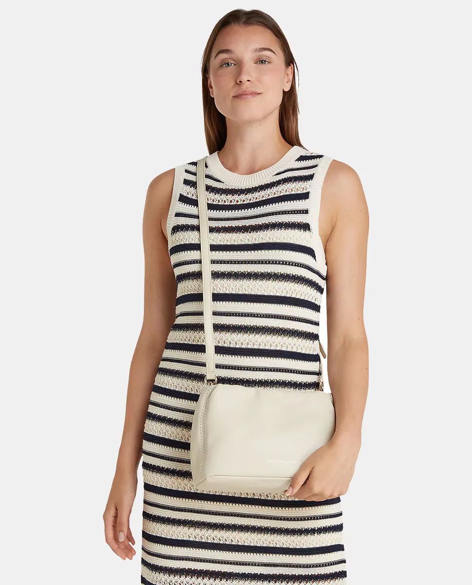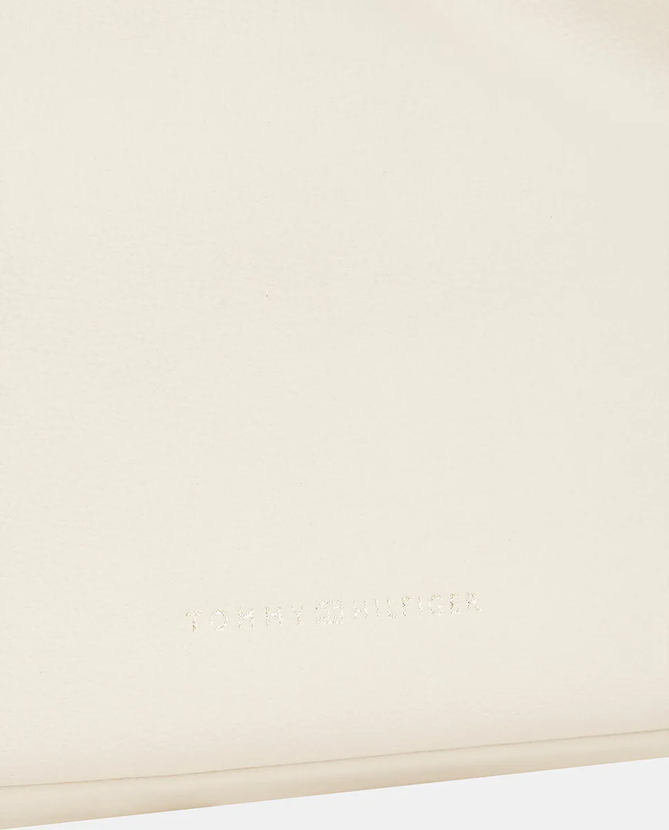 Мини-сумка-ведро для женщин, изготовленная из переработанного полиэстера бежевого цвета. Дизайн с ручкой, регулируемым ремешком и магнитной застежкой. Деталь с фирменным логотипом Tommy Hilfiger на передней части.