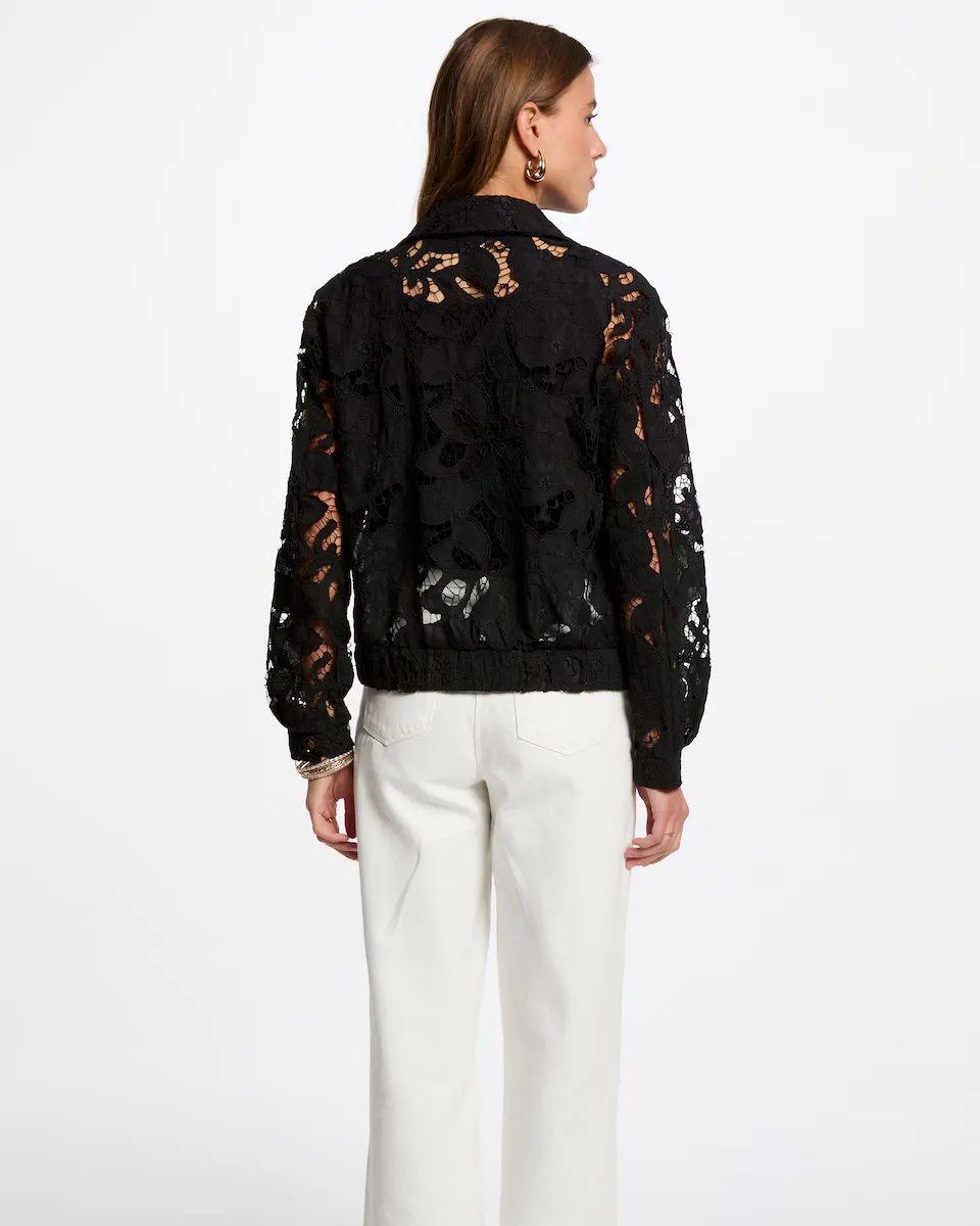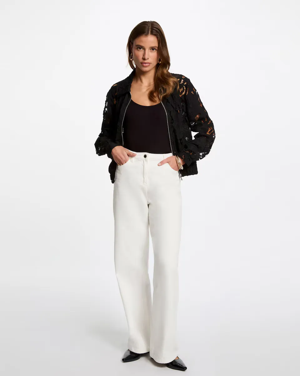 Короткая жакет с кружевом. Прямой крой. Короче. С отложным воротником. Длинный рукав. Молния спереди. 2 кармана с каймой спереди. Кружево Гипюр.