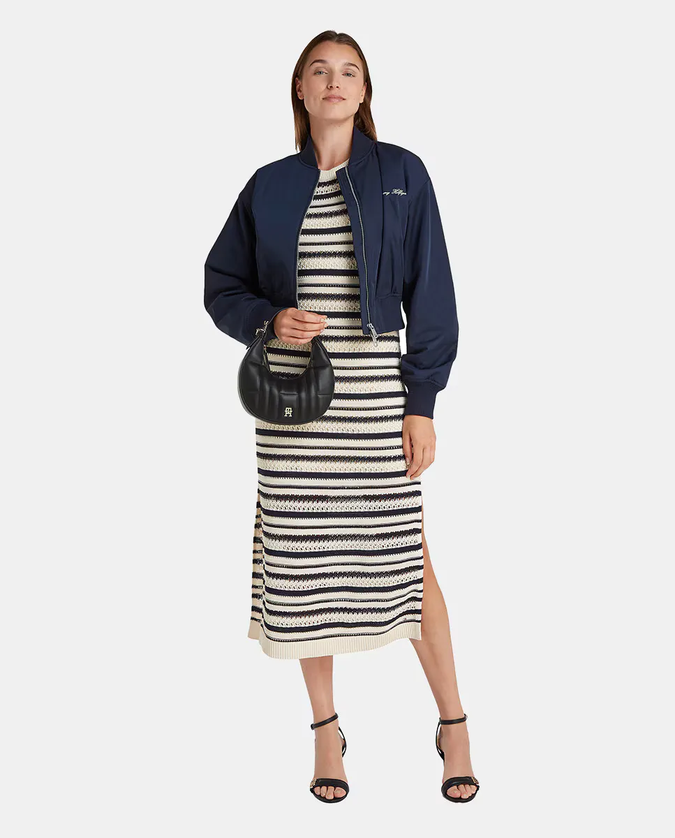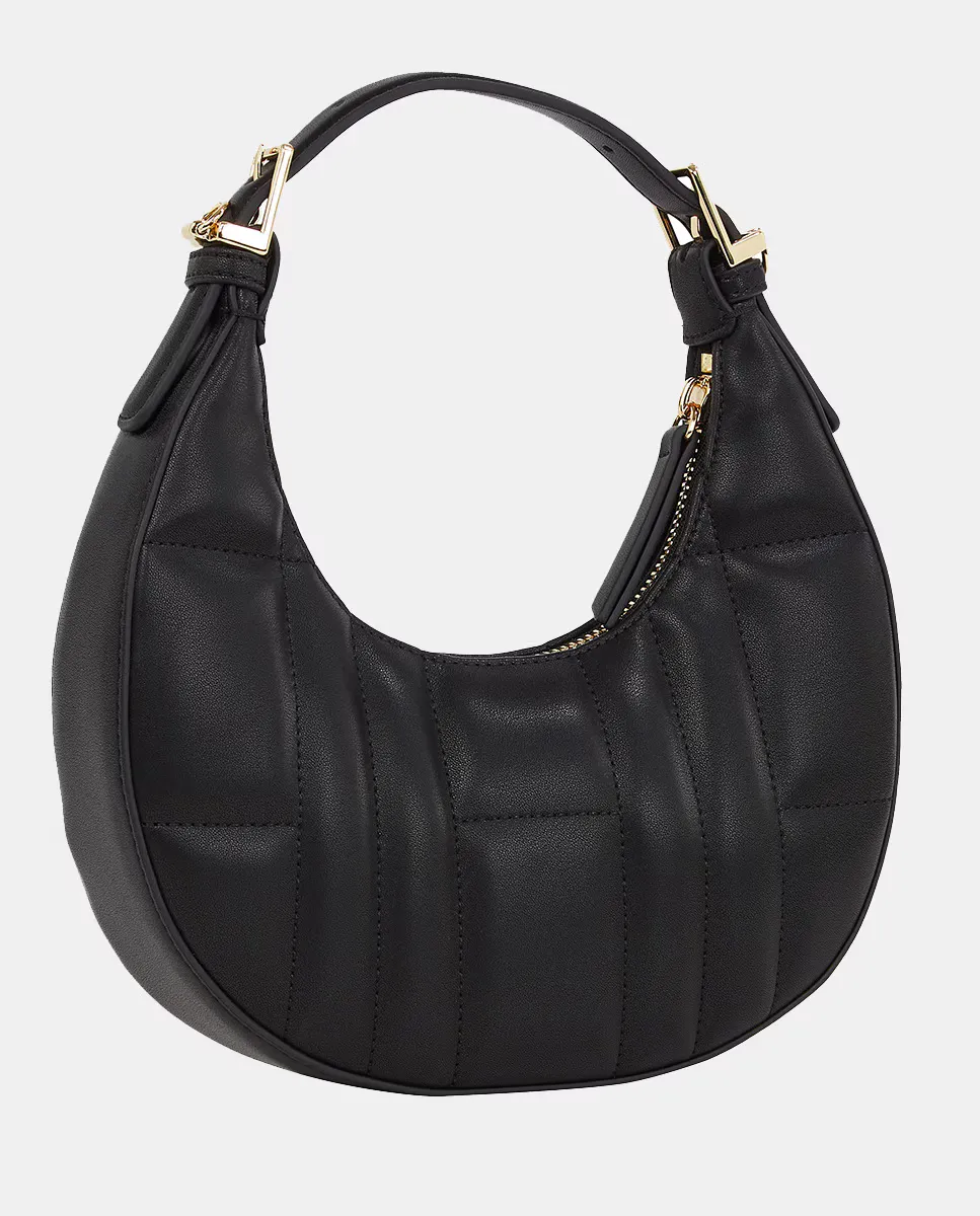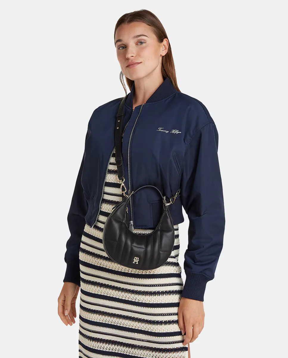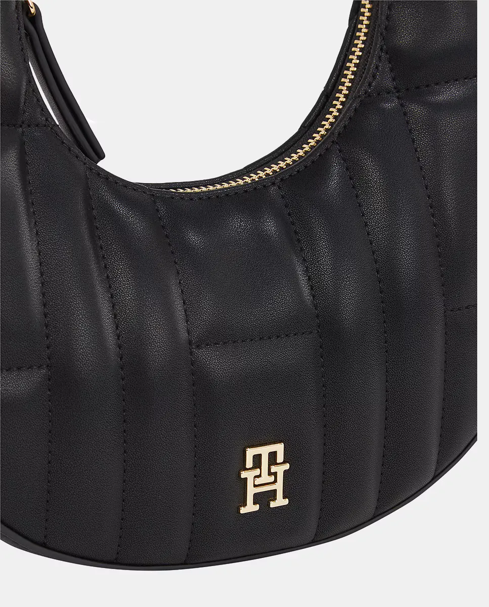 Женская сумка через плечо, выполненная из экокожи черного цвета. Утепленный дизайн с регулируемым плечевым ремешком и застежкой на молнии. Деталь с металлическим логотипом Tommy Hilfiger на передней стороне.