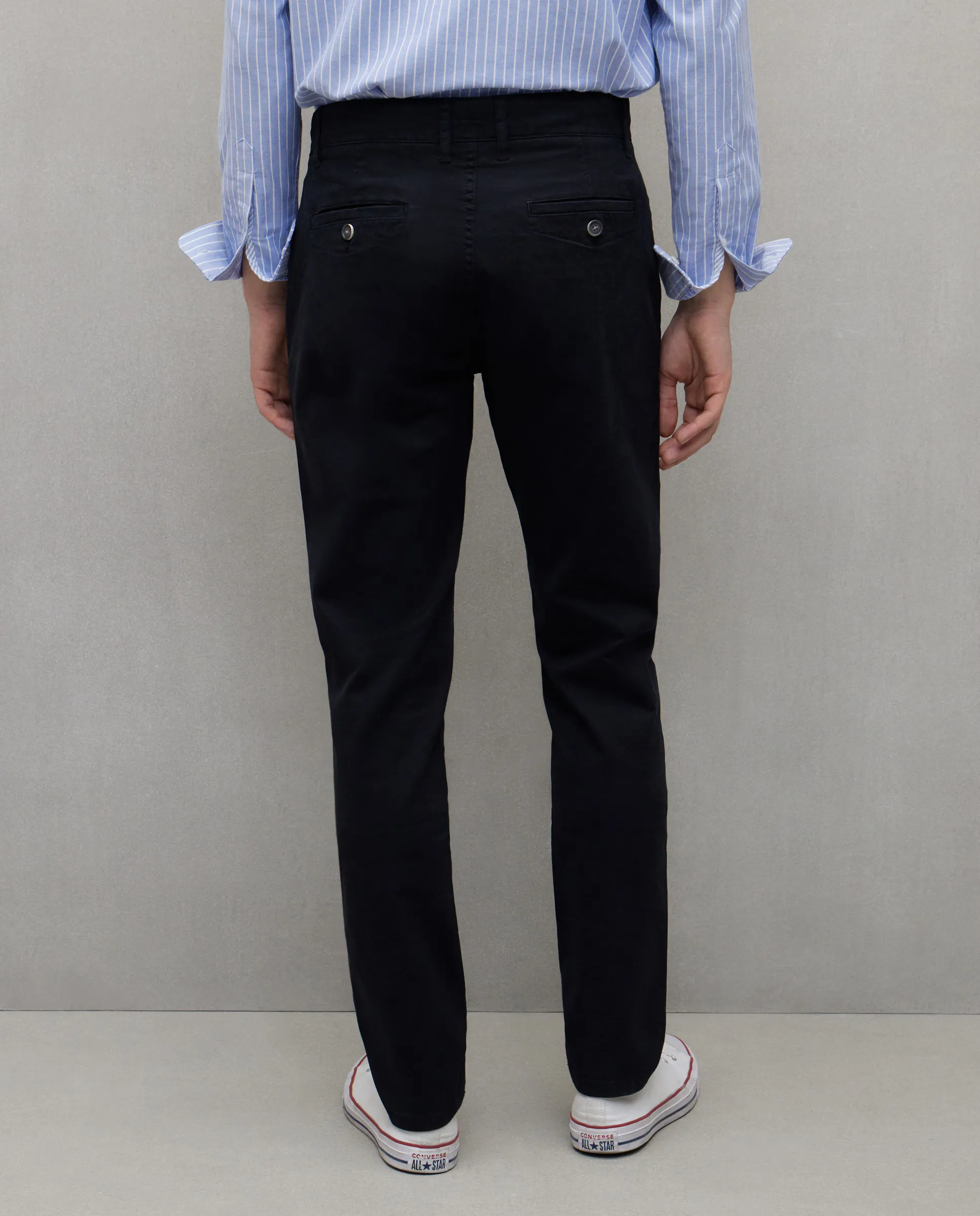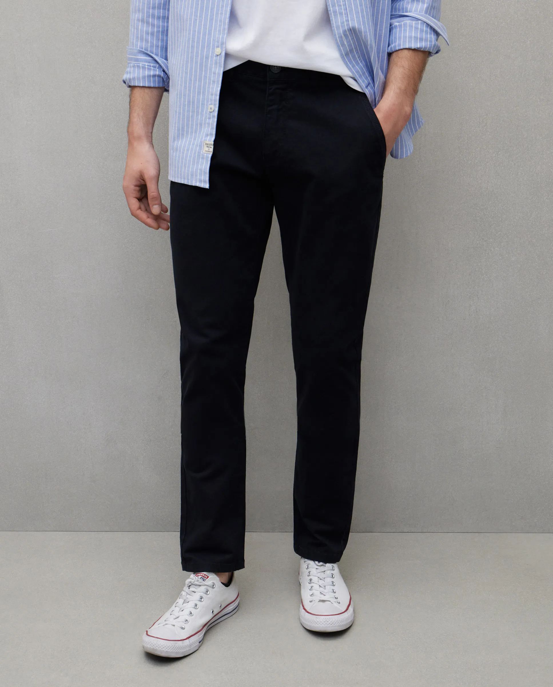 Узкие чиносы с французским карманом. Эластичная ткань для большего комфорта. Застегивается на кнопку и молнию.