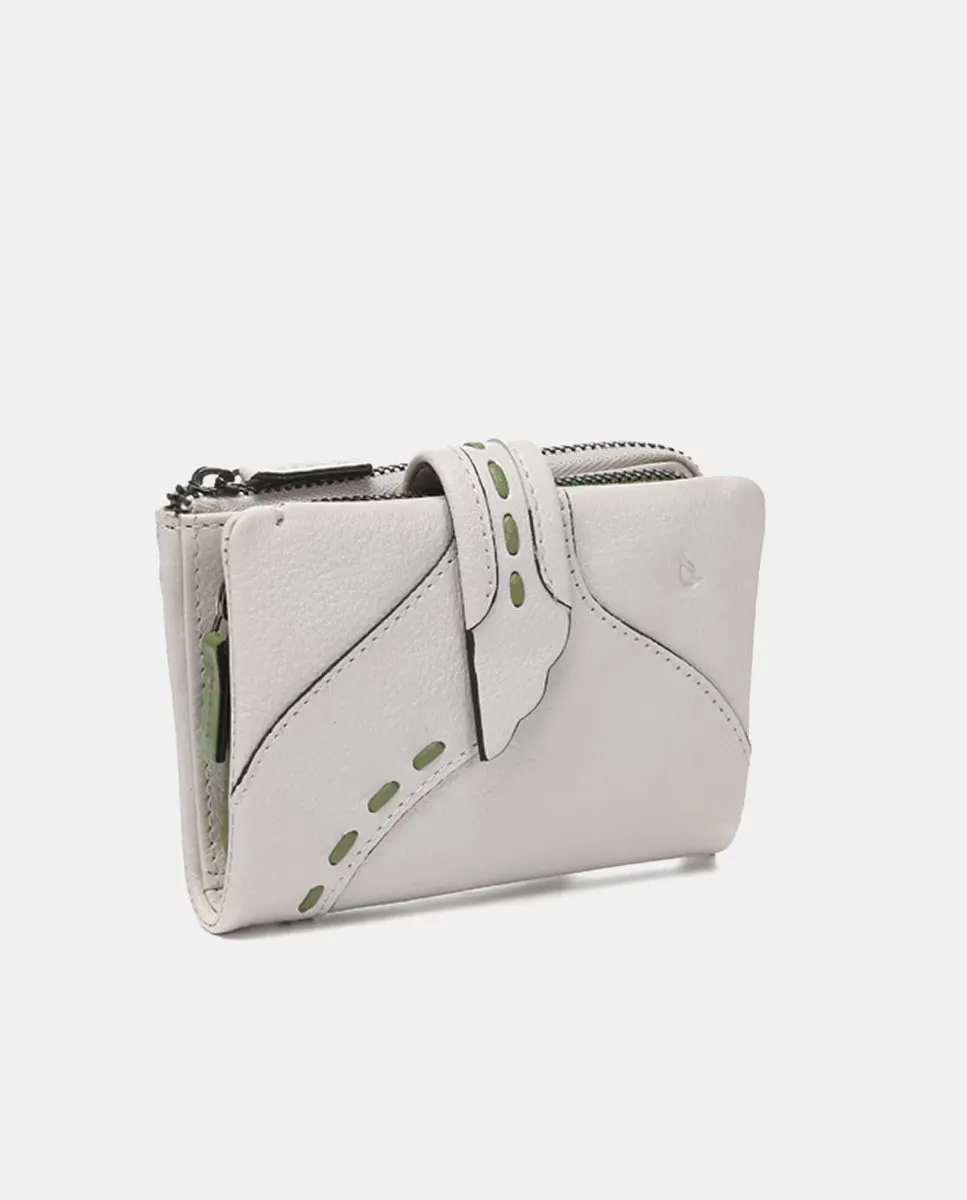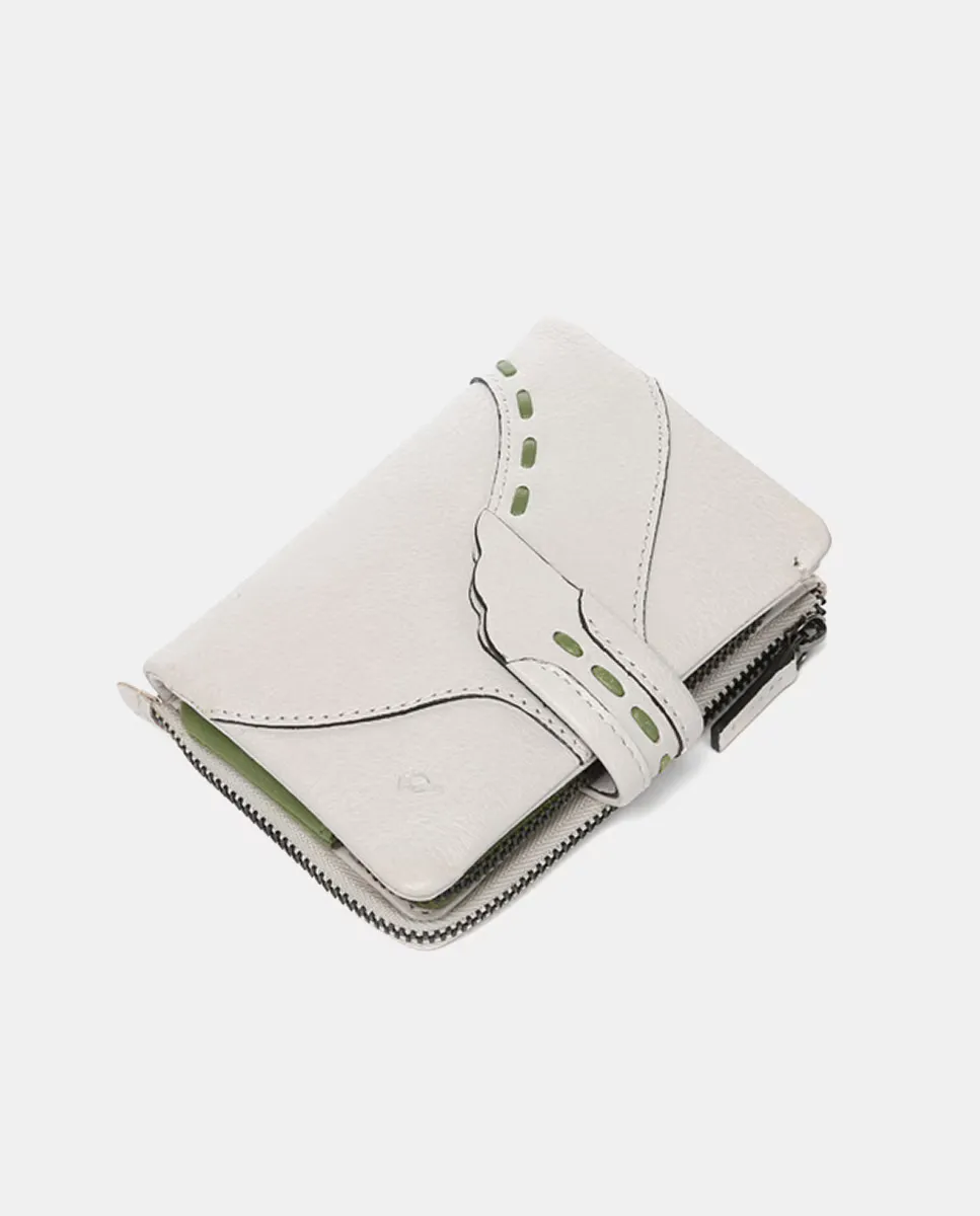 Небольшой женский кошелек, изготовленный из кожи. Дизайн выделяется фронтальной застежкой с клапаном и тонкой вышивкой, которая придает ему изогнутую форму. Внутри есть несколько карманов для карт и отделение для купюр. Съемный кошелек. Снаружи имеется просторный кошелек на молнии.