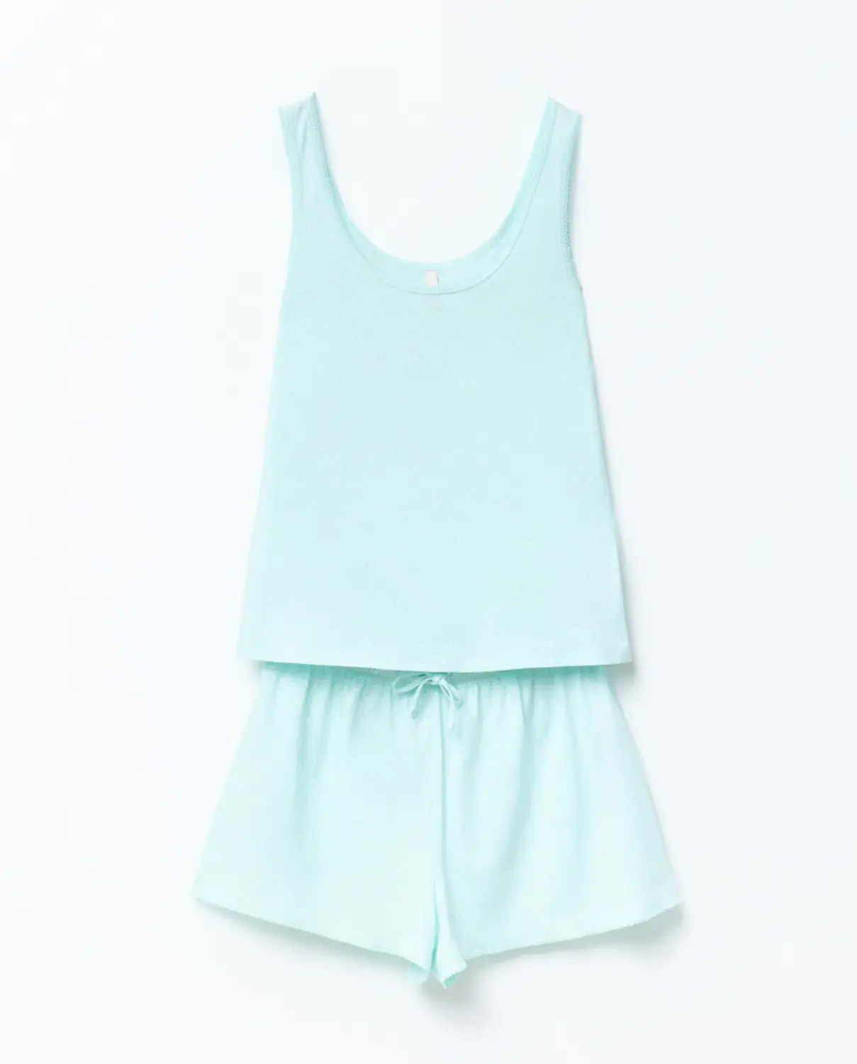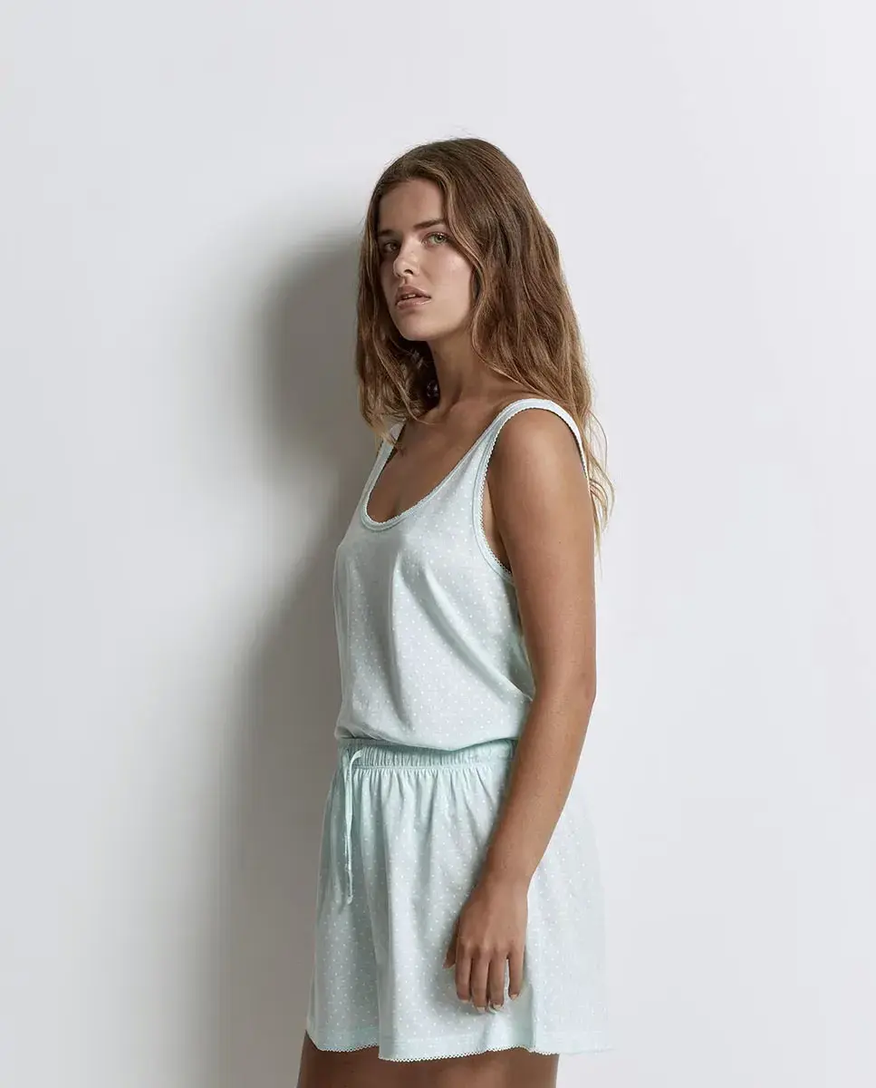 Пижама с топом на тонких бретелях и шортами с рисунком в горошек. Шорты на резинке с завязкой. 100% хлопок.