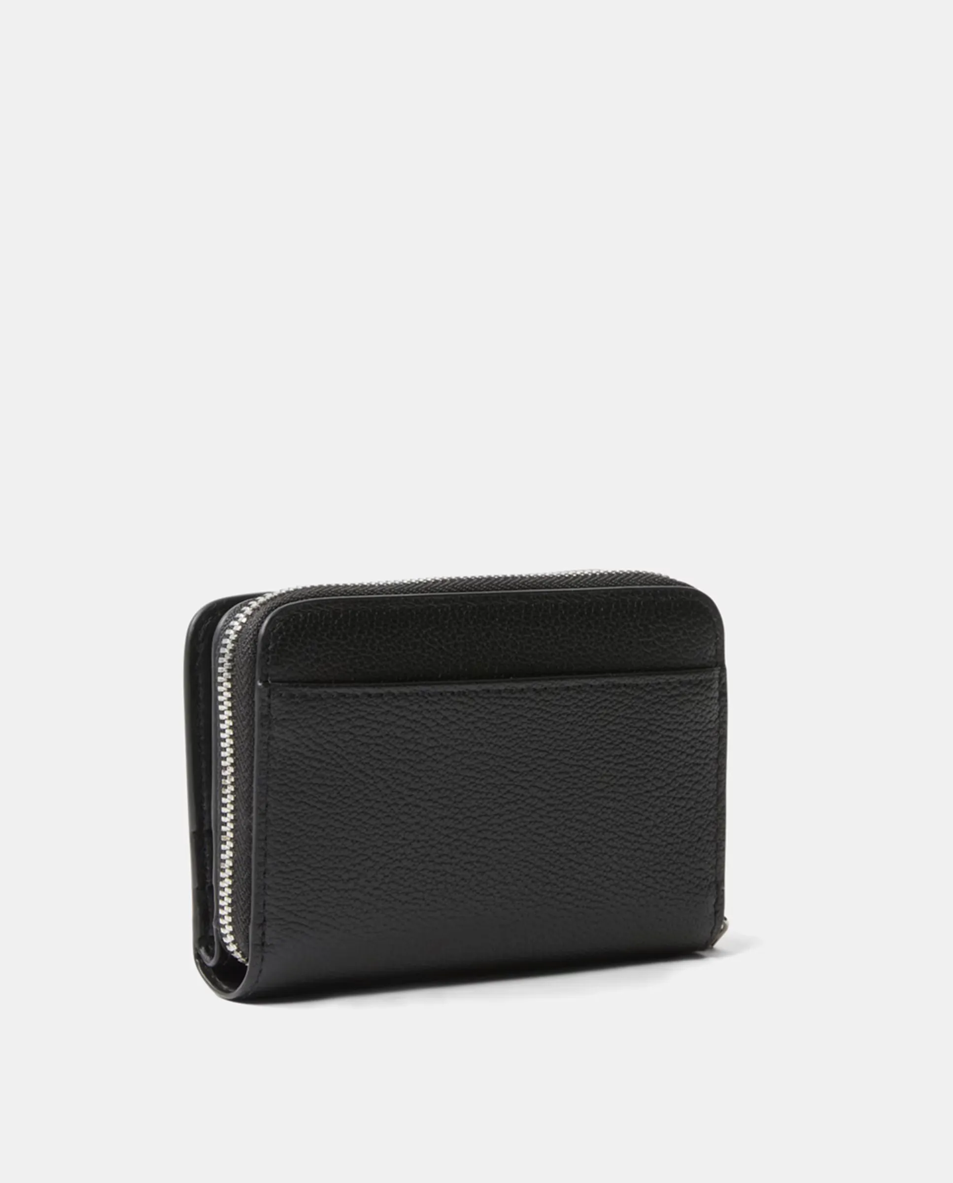 Трифолд кошелек из кожи для женщин черного цвета с кнопочным застежкой на кармане для карт и застежкой на молнии для кошелька. Логотип ck спереди в серебристом цвете.