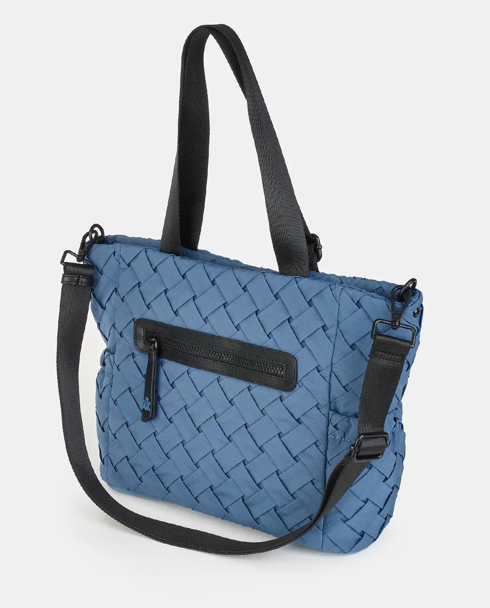 Сумка из плетеного нейлона цвета горчицы с застежкой-молнией. Внешний и задний карманы с молнией. Две длинные ручки и регулируемый длинный ремень с карабином. Внутренний карман на молнии.