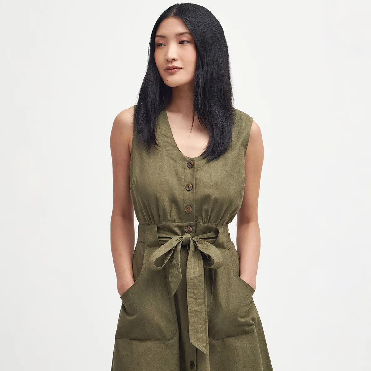 Летнее платье из смеси хлопка и льна, с V-образным вырезом, пуговицами, карманами в юбке и мягкими сборками вокруг талии. Этот стиль включает съемный плетеный пояс и эмблему Barbour на задней части воротника.