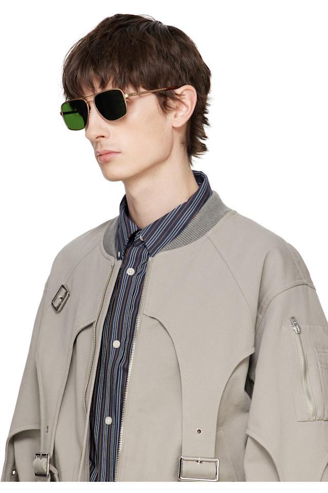 Солнцезащитные очки в стиле «авиаторы» с металлической оправой золотистого оттенка.