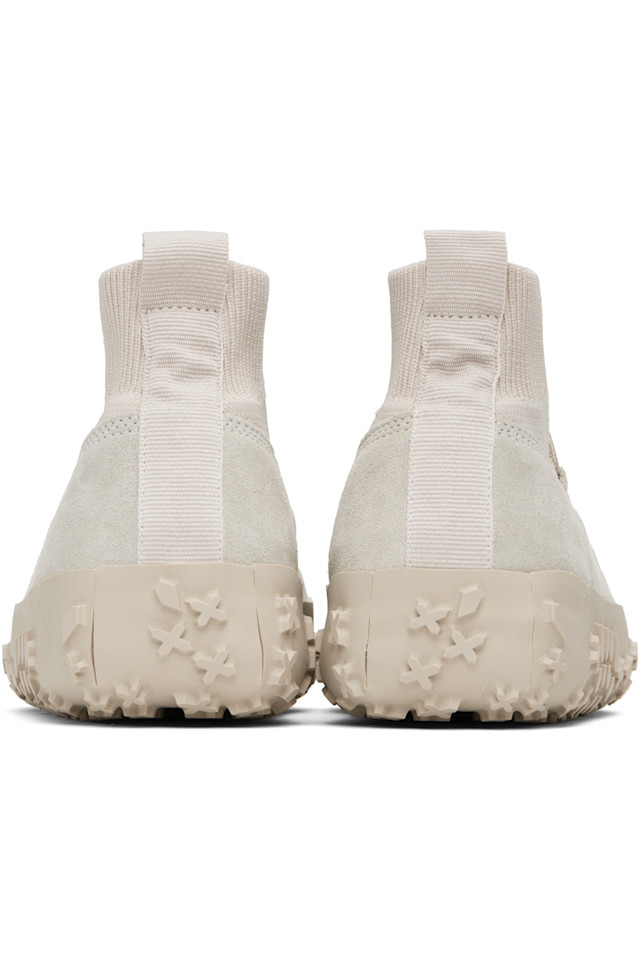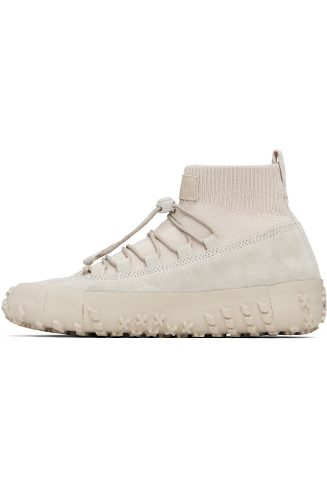 Высокие замшевые и трикотажные кроссовки серого цвета.