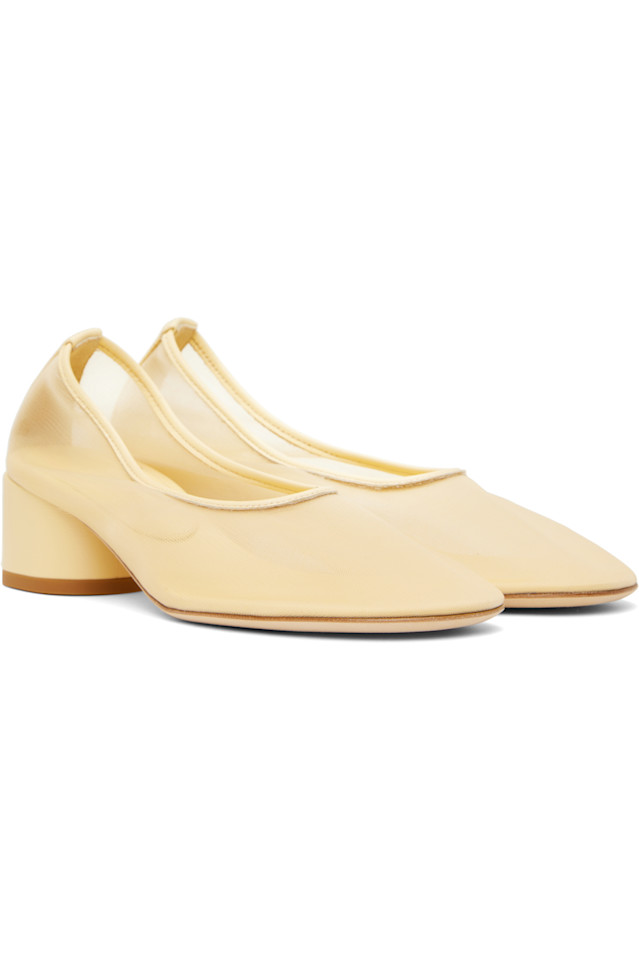Каблуки из полупрозрачной сетки, изготовленные вручную, желтого цвета.
