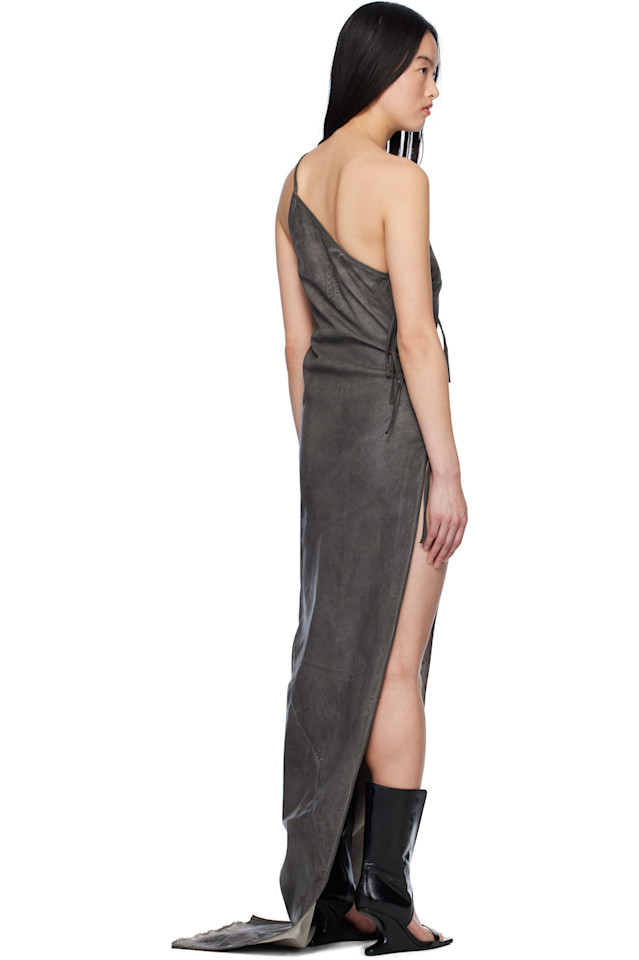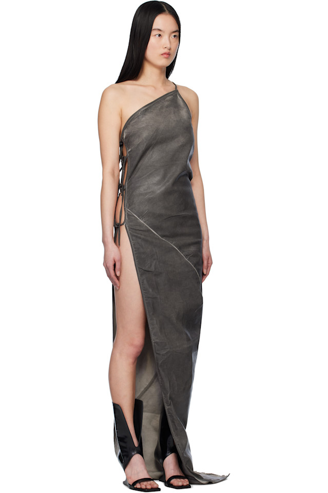 Платье макси из эластичного денима с фольгированным покрытием. Потертости по всей длине.