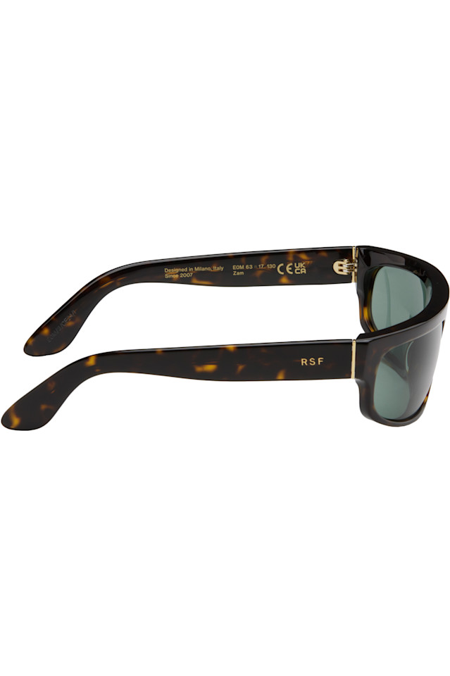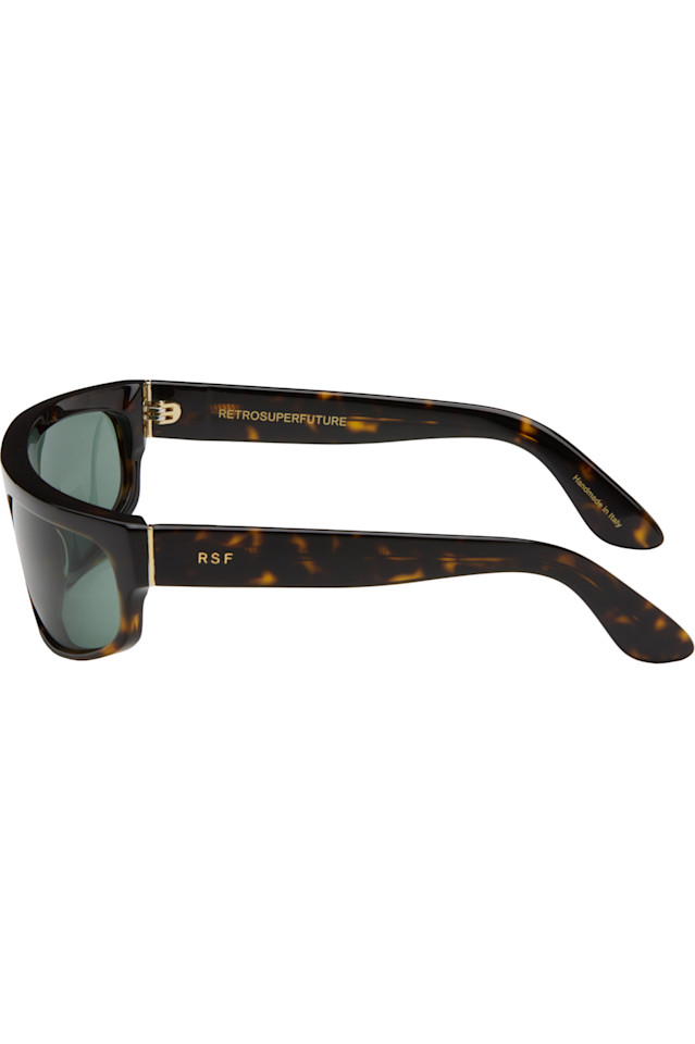 Солнцезащитные очки в прямоугольной черепаховой оправе из ацетата коричневого цвета с обтекаемой формой.