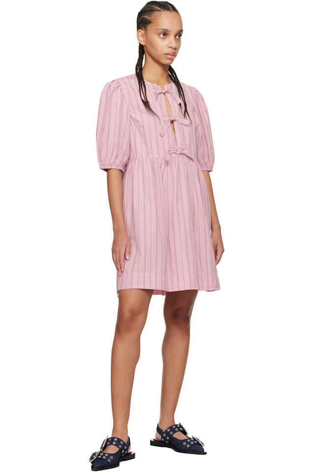 Полосатое хлопковое мини-платье с бантом Ganni, цвет lilac sachet