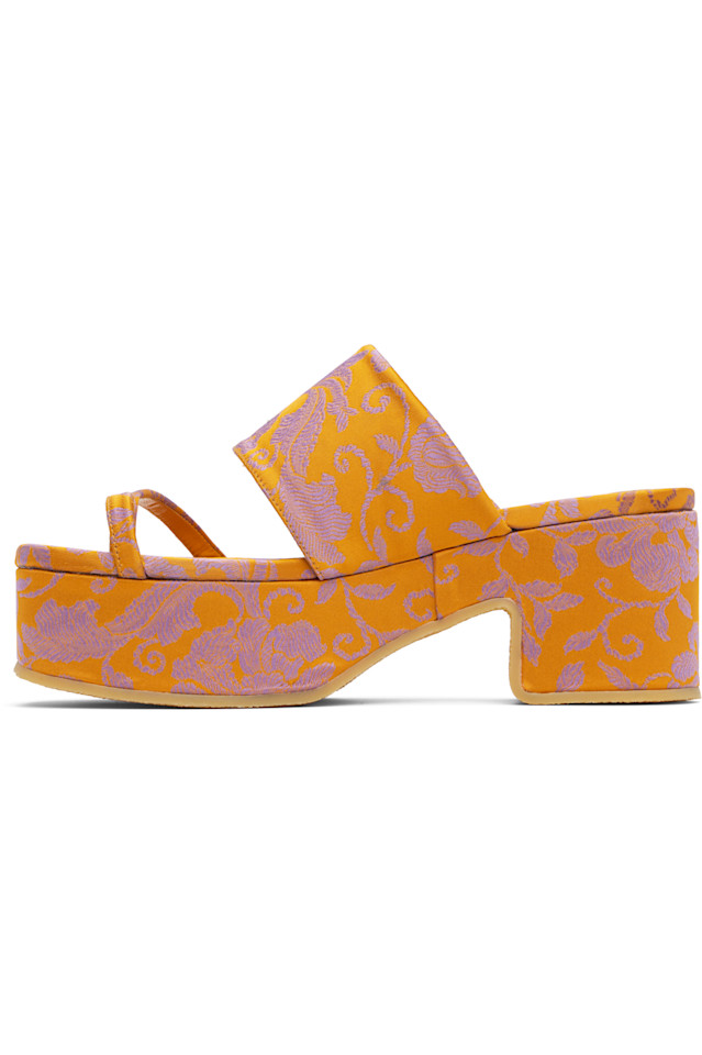 Дамасские босоножки на каблуке без застежек, оранжевого цвета.