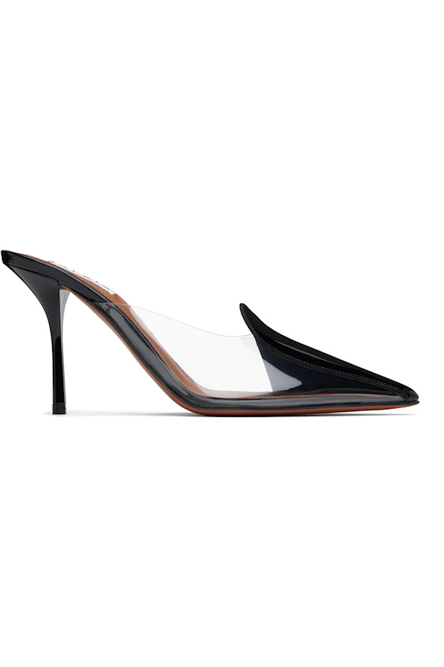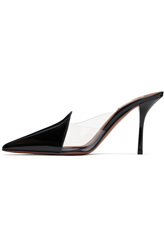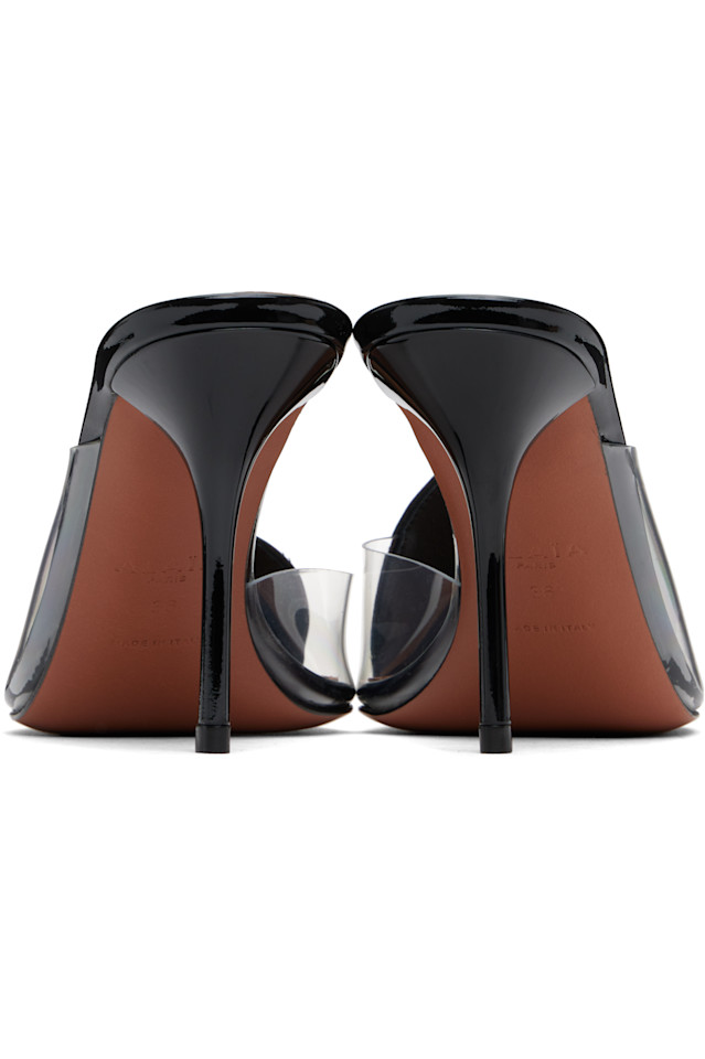 Мюли из прозрачного винила и лакированной телячьей кожи черного цвета.