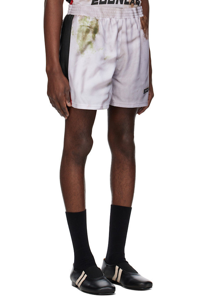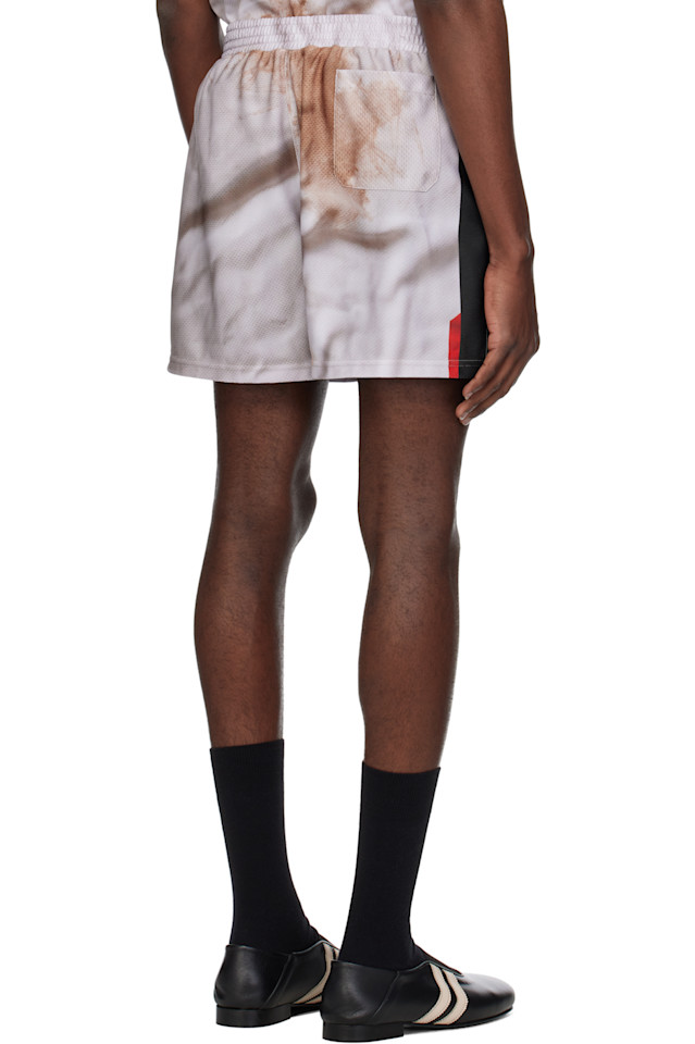 Шорты из полиэстеровой сетки. Графический рисунок напечатан по всей длине.