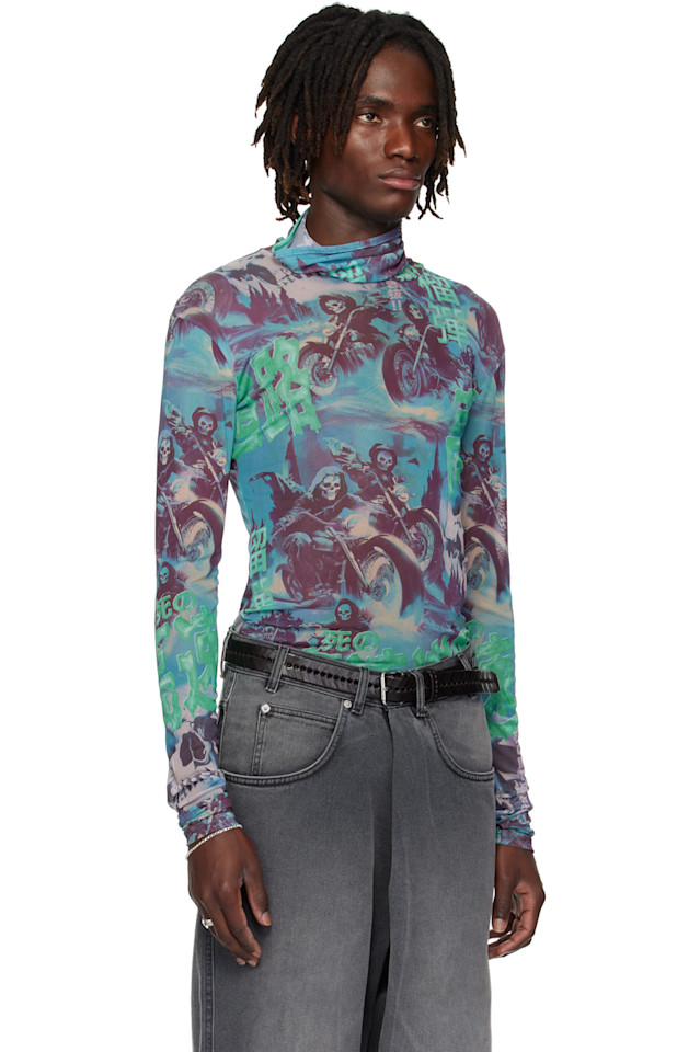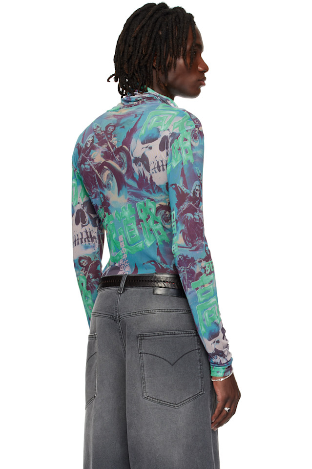 Лёгкая и прозрачная водолазка из эластичной сетки. Графический рисунок нанесён по всей длине.