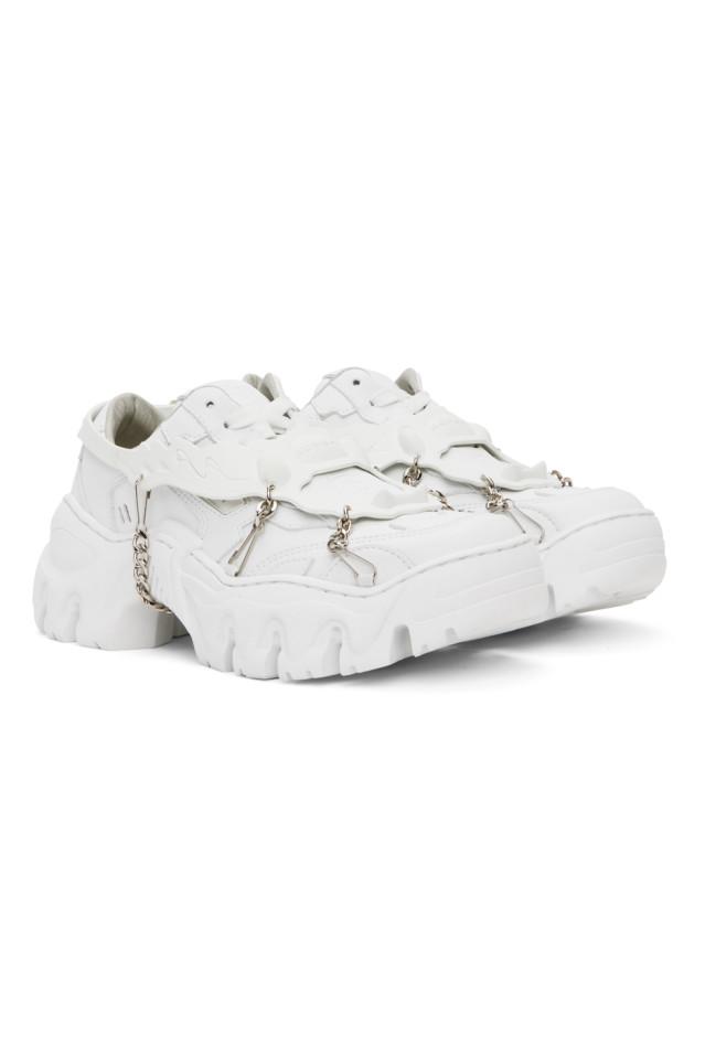 Низкие кеды ручной работы из полированной искусственной кожи белого цвета. Съёмная резиновая накладка и цепочка в стиле шлеи.