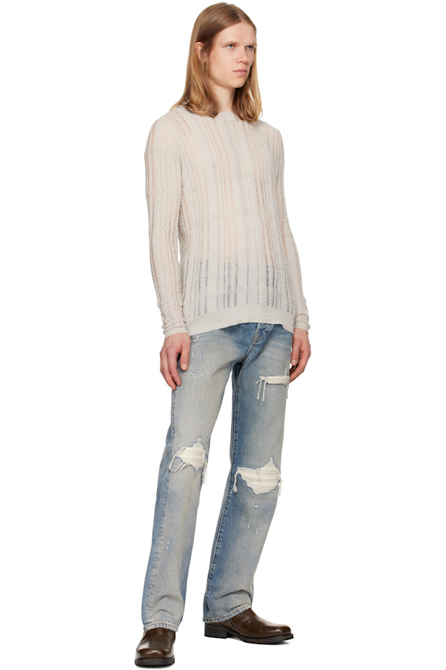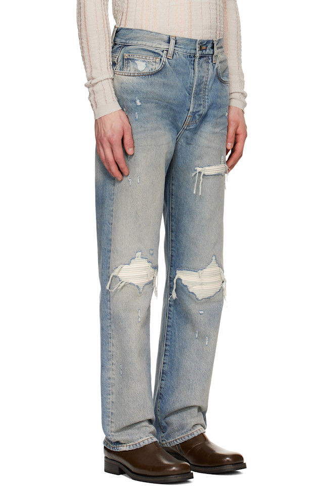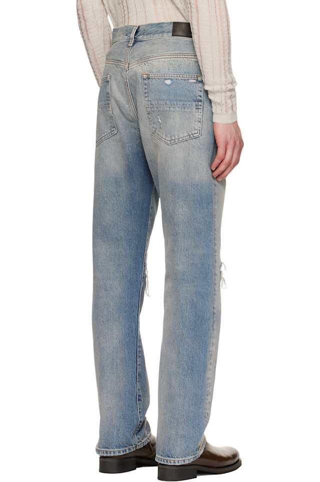 Джинсы прямого кроя из неэластичного денима. Потертости, заломы и потертости на руках.