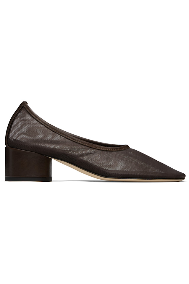Каблуки из полупрозрачной сетки ручной работы коричневого цвета.