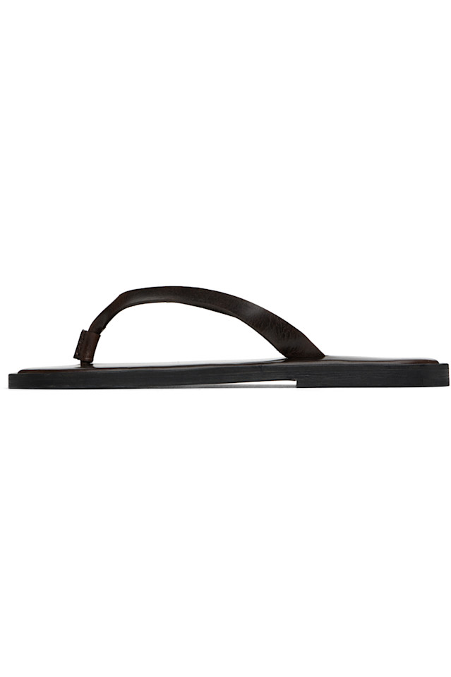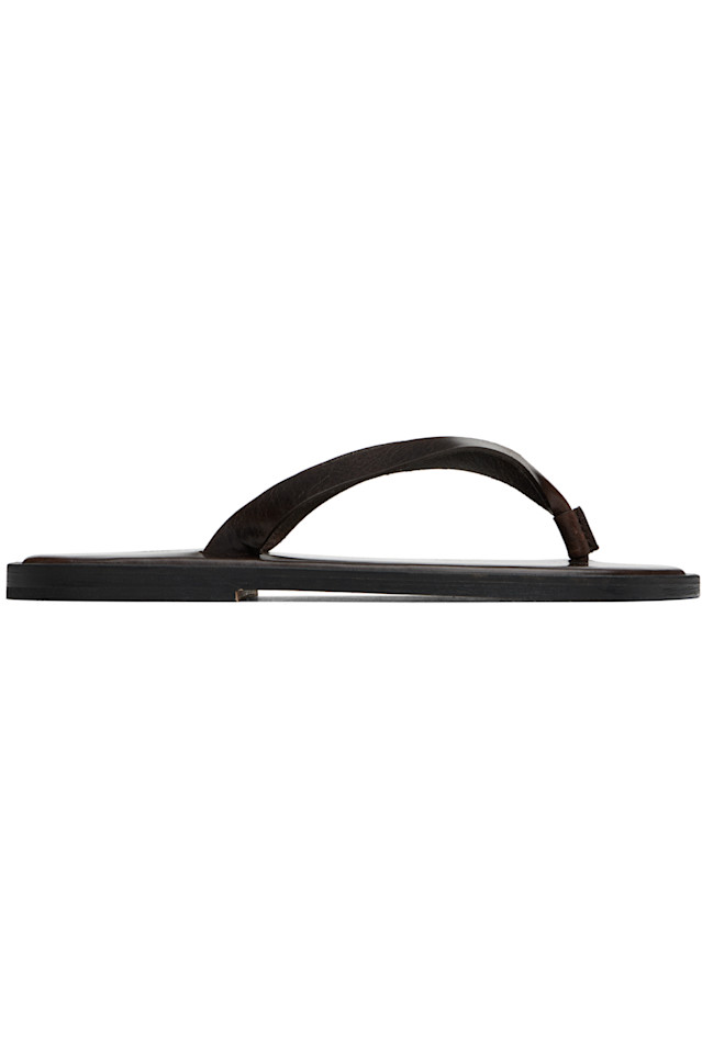 Шлёпанцы из зернистой кожи коричневого цвета.