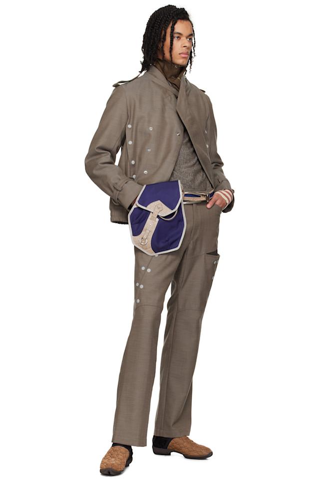 Сумка-мессенджер из телячьей кожи с тиснением под крокодила и нейлоновой тафты синего и коричневого цветов.