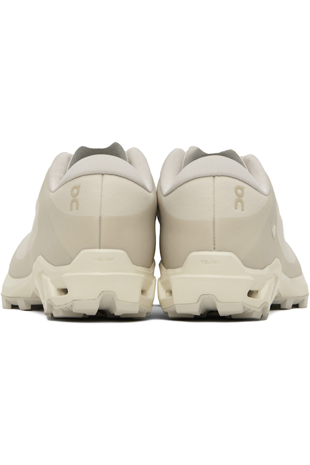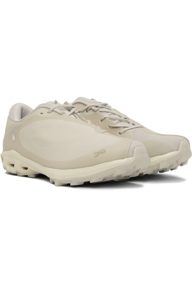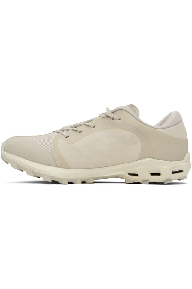 Низкие кроссовки из склеенного трикотажа и сетки бежевого цвета.