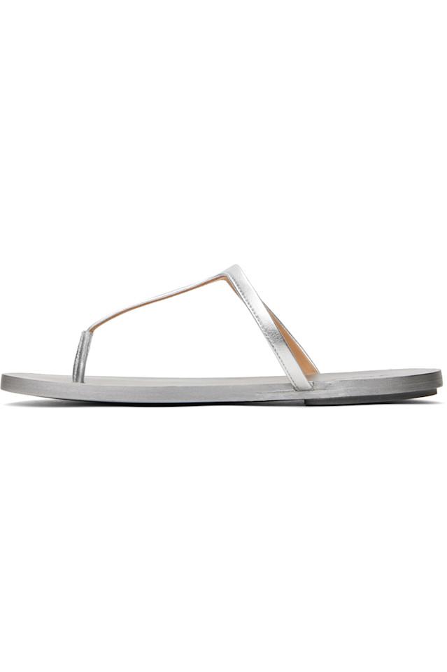 Сандалии из ламинированной зернистой кожи серебристо-металлического оттенка.