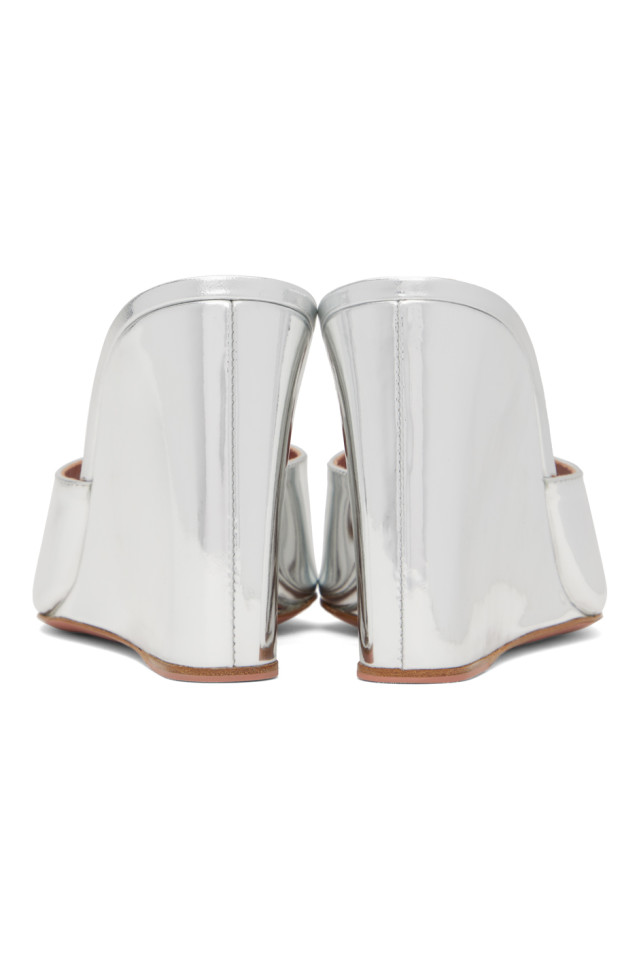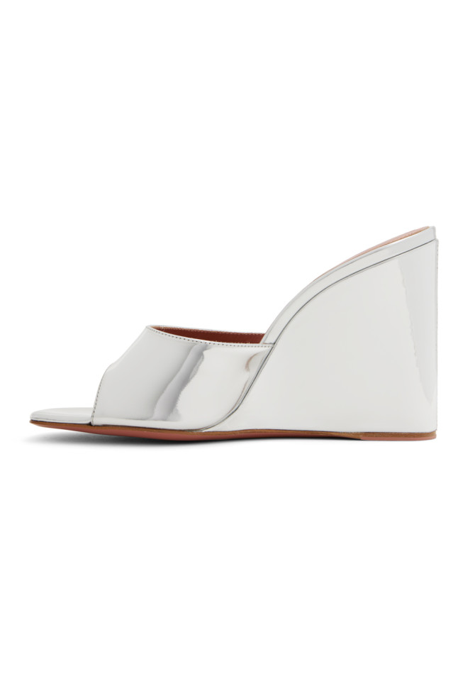 Босоножки на каблуке из полированной кожи серебристо-металлического оттенка.