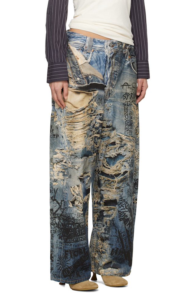 Джинсы из неэластичного денима. По всей длине нанесены выцветшие элементы и эффект оптической иллюзии.