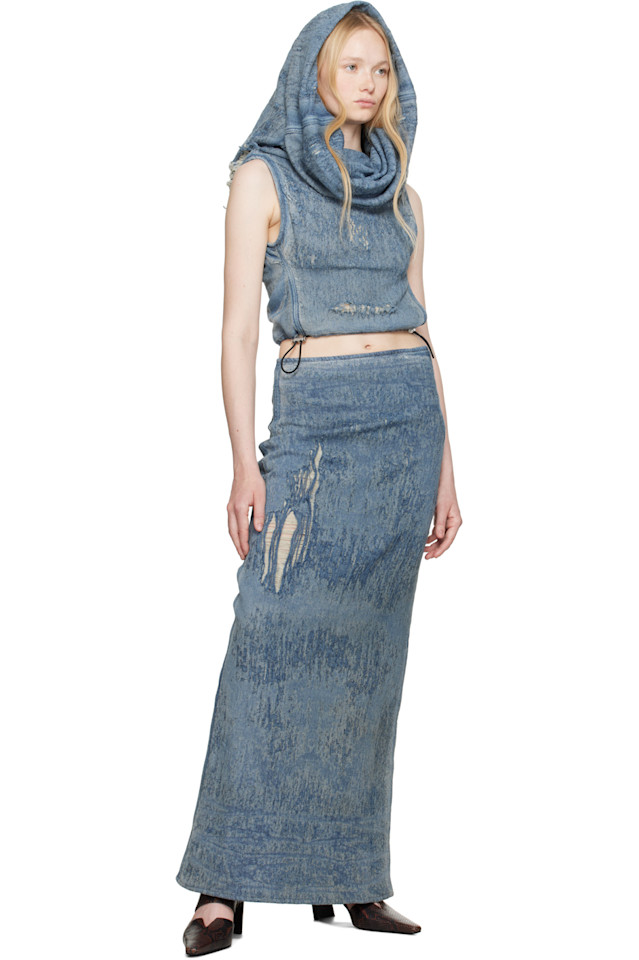 Юбка макси из эластичного денима. Потертости и выцветание по всей длине.