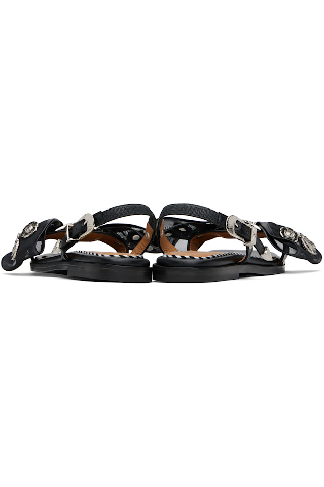 Сандалии из полированной кожи черного цвета на плоской подошве.