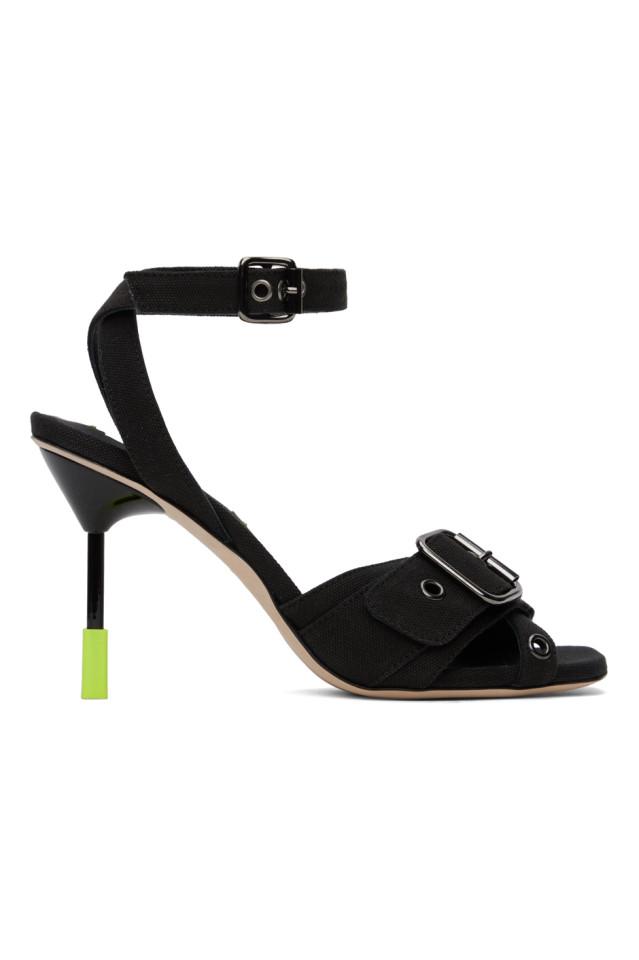 Босоножки на каблуке из парусины черного цвета.