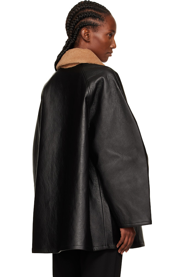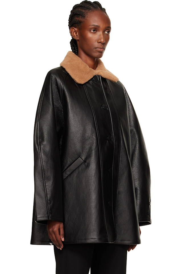 Пальто из жатой искусственной кожи. Отложной воротник из верблюжьей шерсти и шёлкового флиса.