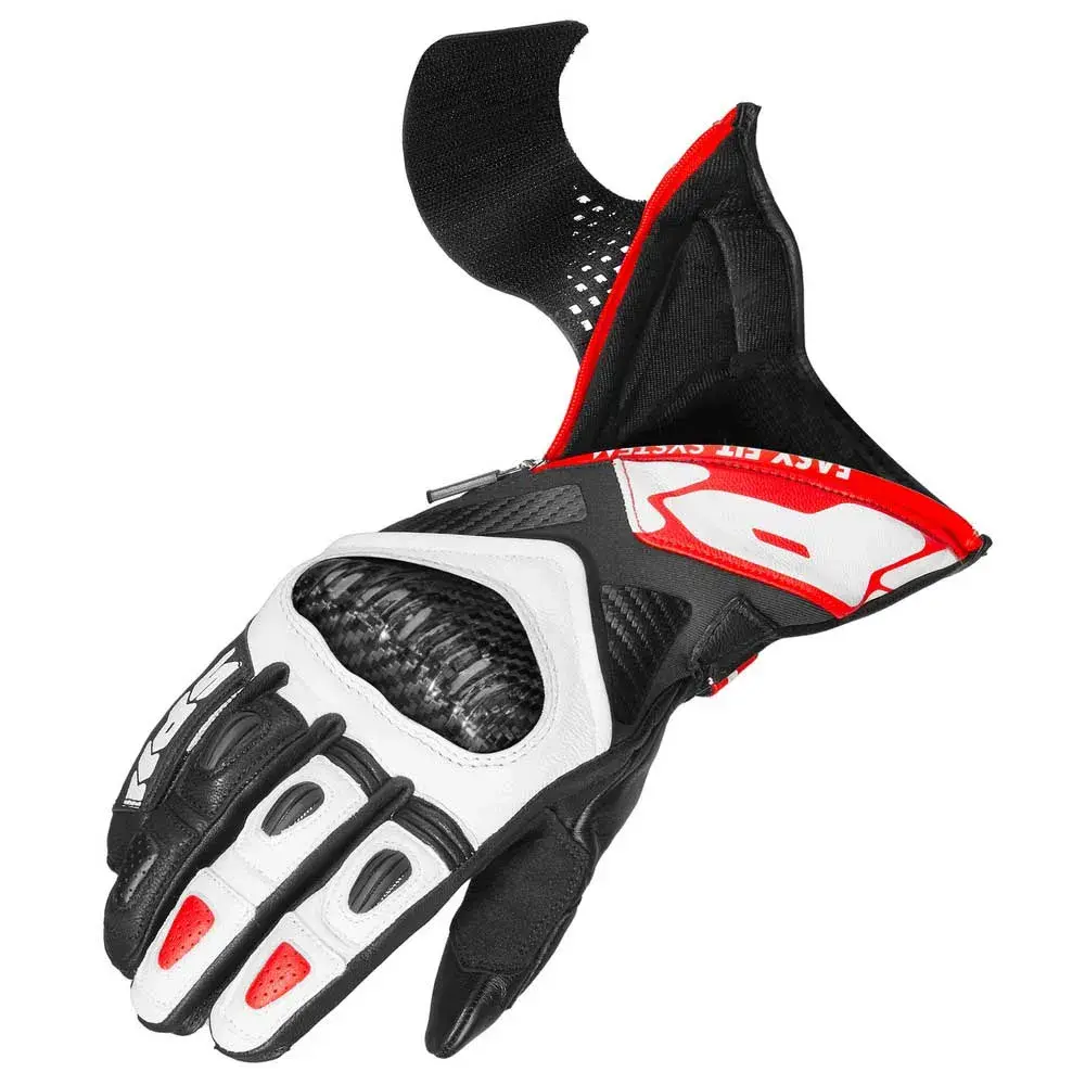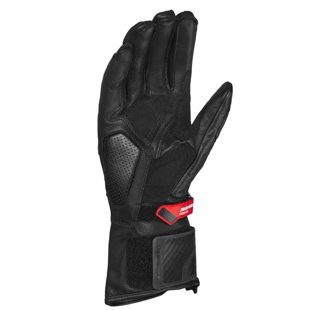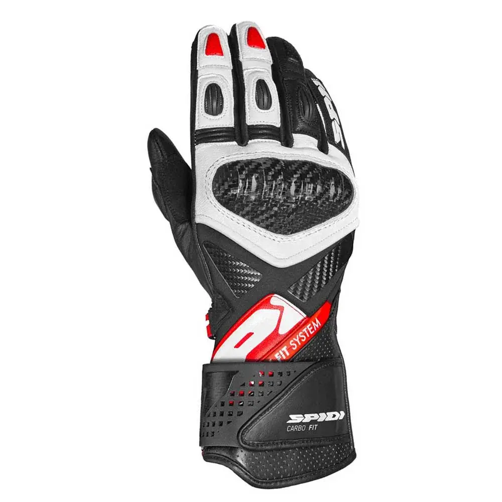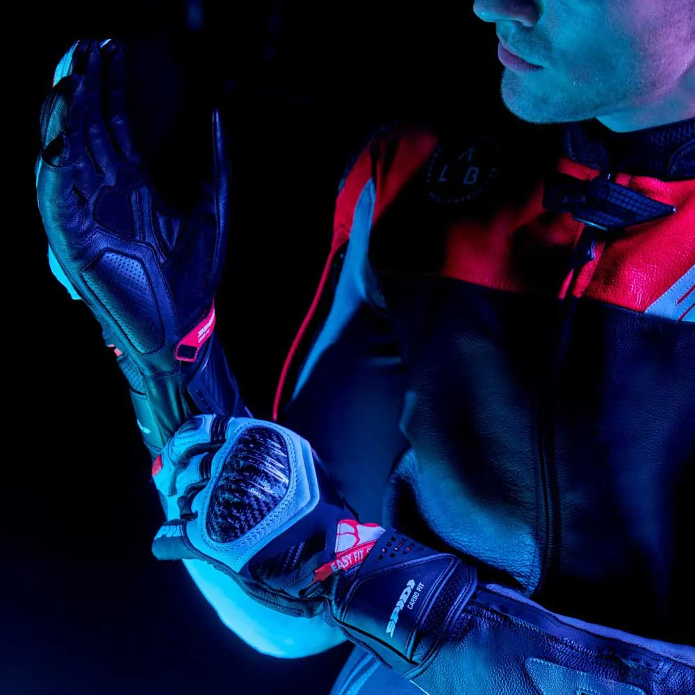 В этих перчатках сочетаются элементы безопасности премиум-класса, характерные для перчаток, используемых гонщиками SPIDI, с новой системой Easy-Fit: благодаря использованию широкой эластичной ленты на липучке и молнии YKK отверстие перчатки становится значительно больше. Это значительно улучшает операции закрывания и открывания, что является большим преимуществом, особенно в случае повышенного потоотделения, что является обычной ситуацией во время гонок или трековых дней. Перчатки Carbo Fit изготовлены с использованием комбинации высококачественной воловьей кожи, высокопрочных керамидных усилителей, деталей из ТПУ с вентиляцией на пальцах и наколенников из углеродного волокна. Они получили сертификат EN 13594: 2015 KP Level 1 и совместимы с сенсорными экранами.