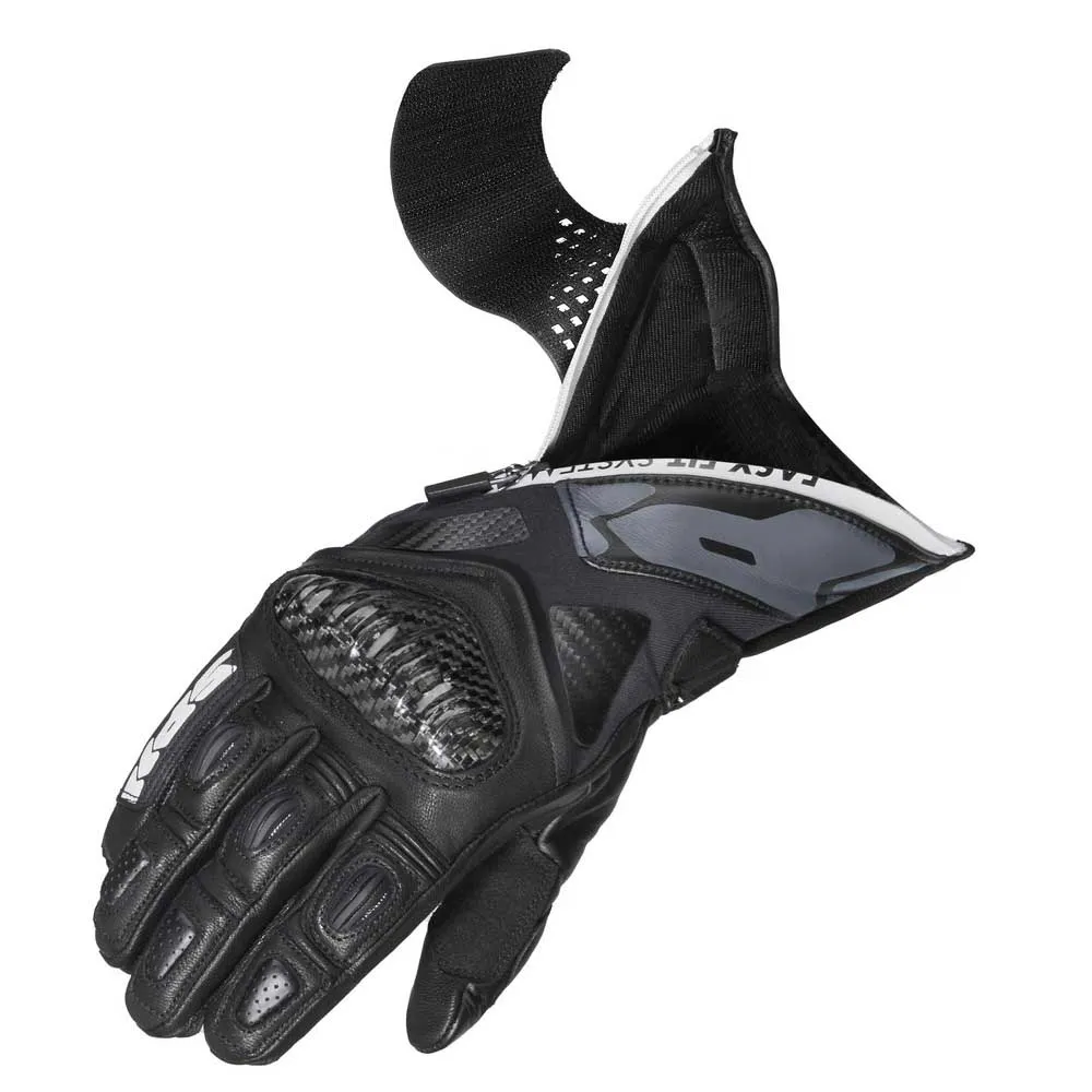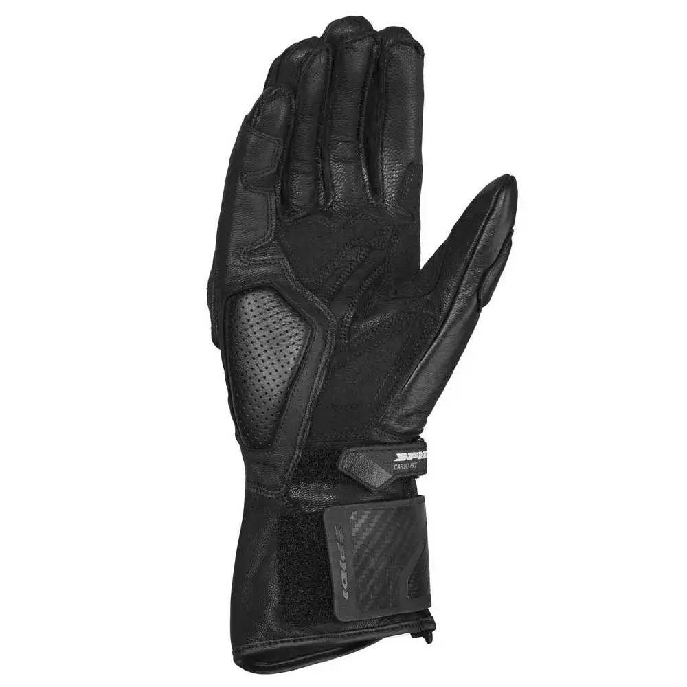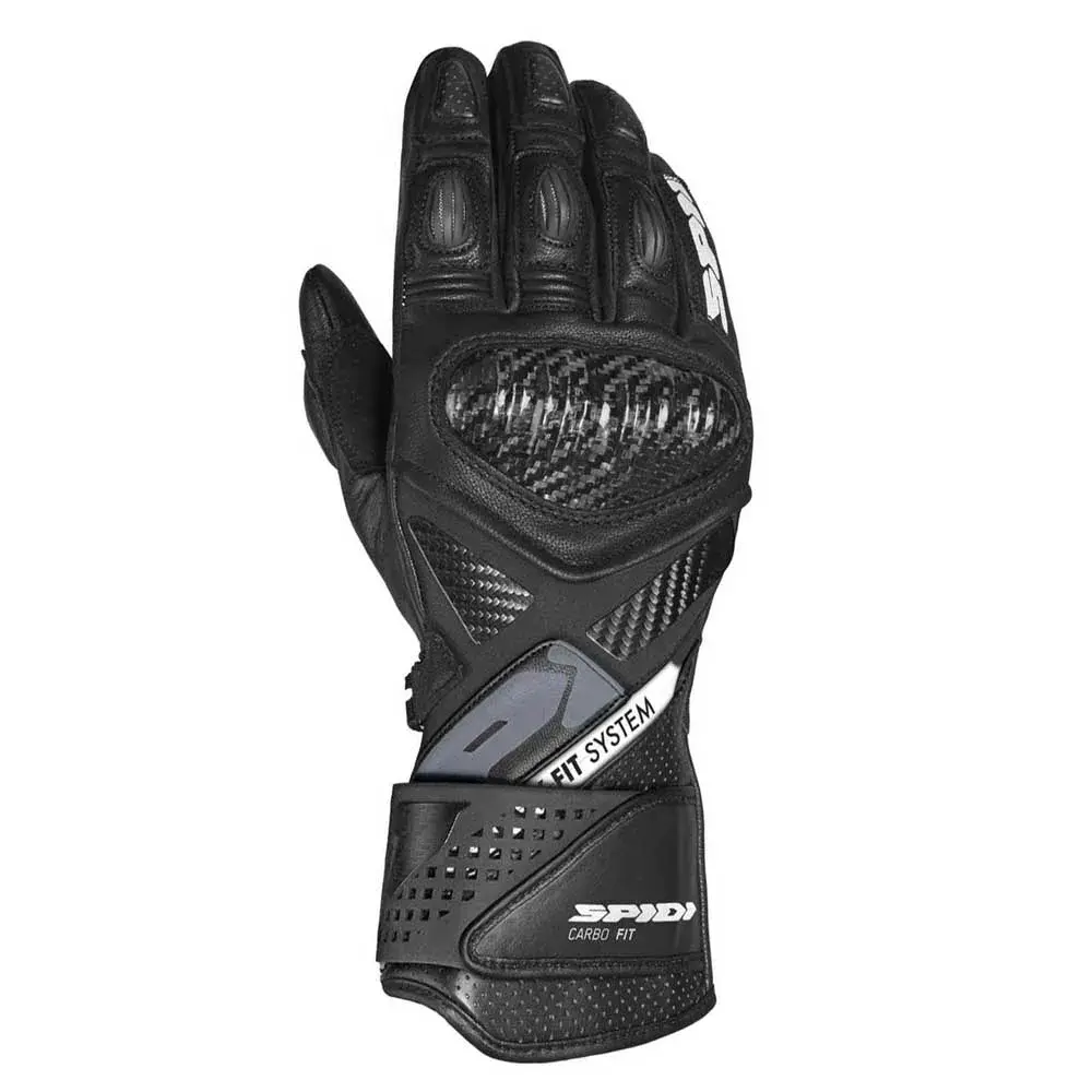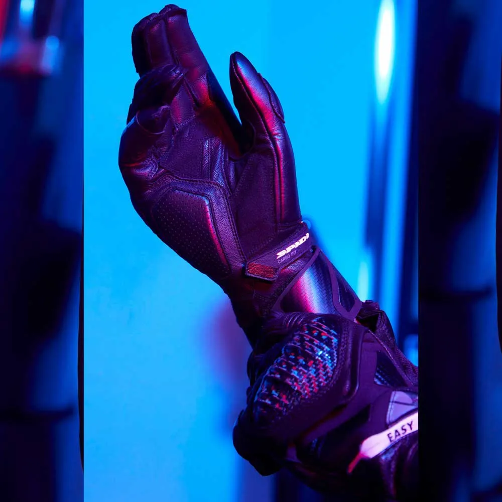 В этих перчатках сочетаются элементы безопасности премиум-класса, характерные для перчаток, используемых гонщиками SPIDI, с новой системой Easy-Fit: благодаря использованию широкой эластичной ленты на липучке и молнии YKK отверстие перчатки становится значительно больше. Это значительно улучшает операции закрывания и открывания, что является большим преимуществом, особенно в случае повышенного потоотделения, что является обычной ситуацией во время гонок или трековых дней. Перчатки Carbo Fit изготовлены с использованием комбинации высококачественной воловьей кожи, высокопрочных керамидных усилителей, деталей из ТПУ с вентиляцией на пальцах и наколенников из углеродного волокна. Они получили сертификат EN 13594: 2015 KP Level 1 и совместимы с сенсорными экранами.