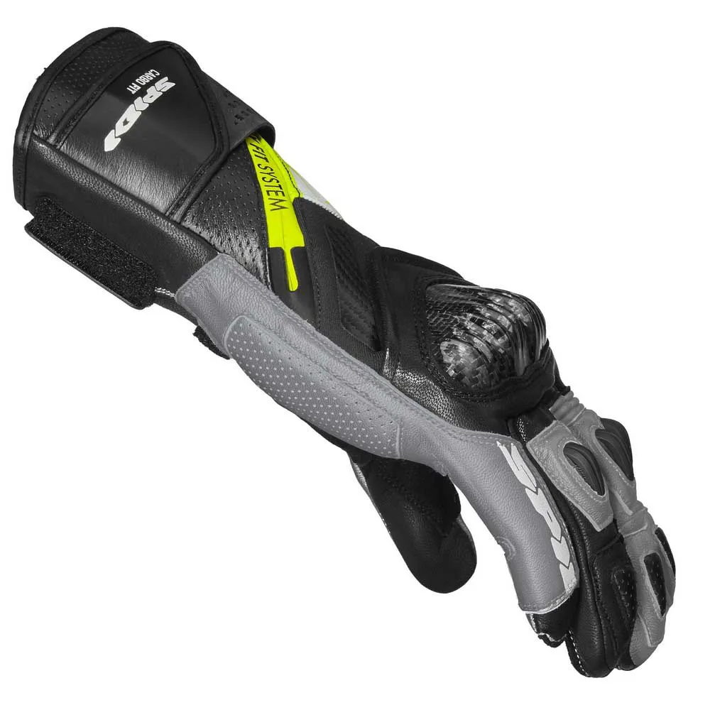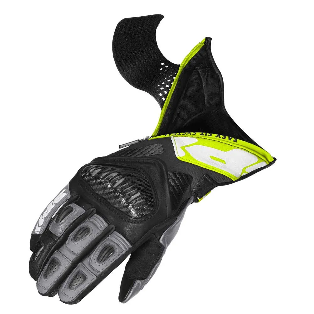 В этих перчатках сочетаются элементы безопасности премиум-класса, характерные для перчаток, используемых гонщиками SPIDI, с новой системой Easy-Fit: благодаря использованию широкой эластичной ленты на липучке и молнии YKK отверстие перчатки становится значительно больше. Это значительно улучшает операции закрывания и открывания, что является большим преимуществом, особенно в случае повышенного потоотделения, что является обычной ситуацией во время гонок или трековых дней. Перчатки Carbo Fit изготовлены с использованием комбинации высококачественной воловьей кожи, высокопрочных керамидных усилителей, деталей из ТПУ с вентиляцией на пальцах и наколенников из углеродного волокна. Они получили сертификат EN 13594: 2015 KP Level 1 и совместимы с сенсорными экранами.