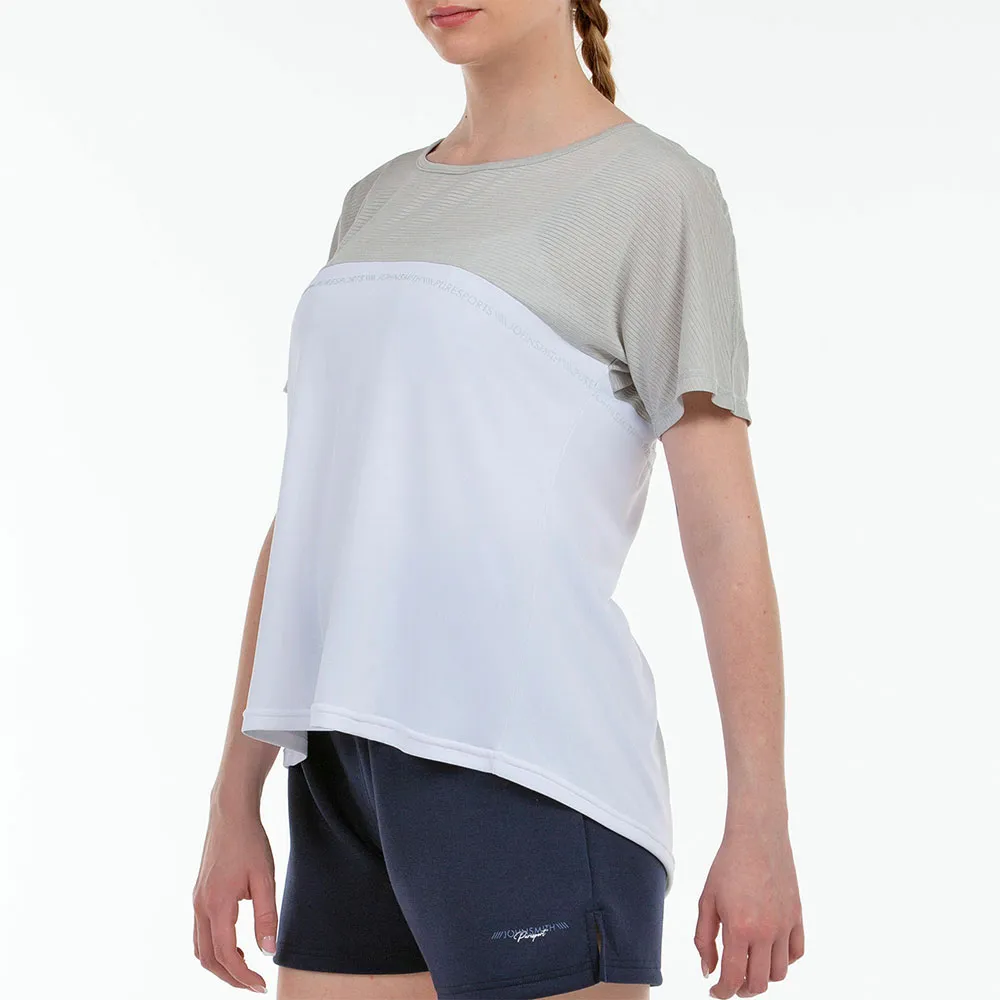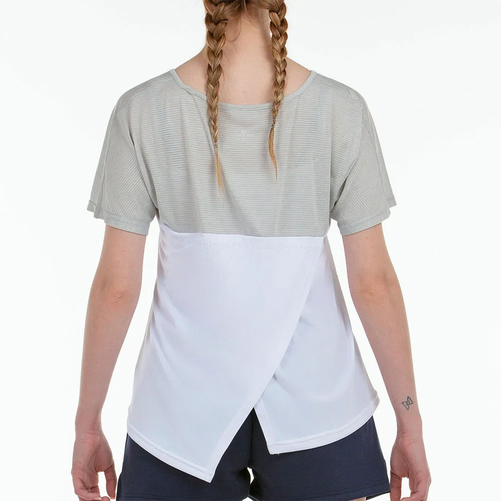 Легкая футболка из полиэстеровой ткани, сочетающая в себе однотонную вязку и ткани с полосатым эффектом, что обогащает изделие.