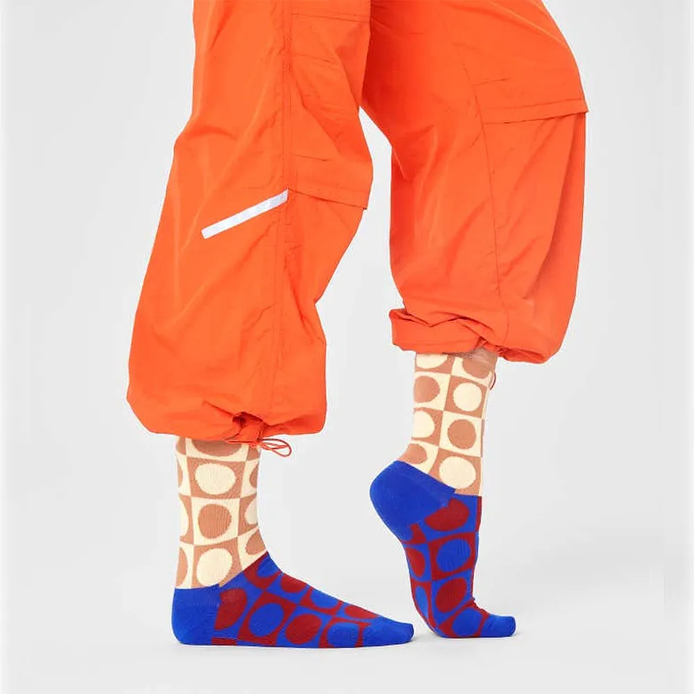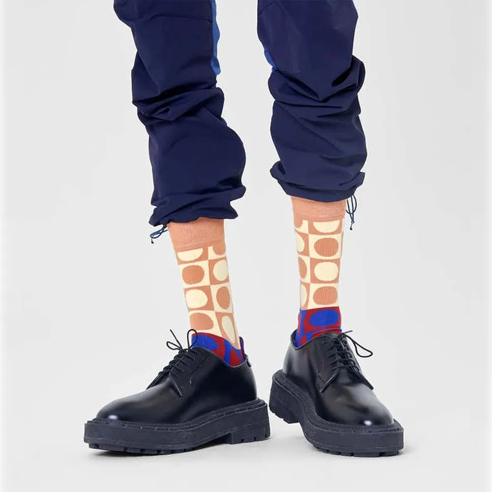 Пара разноцветных носков с комбинацией квадратов и кругов, а также с комбинацией разных цветов, таких как красный, синий или бежевый.