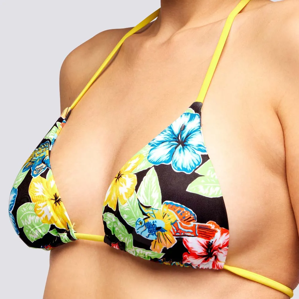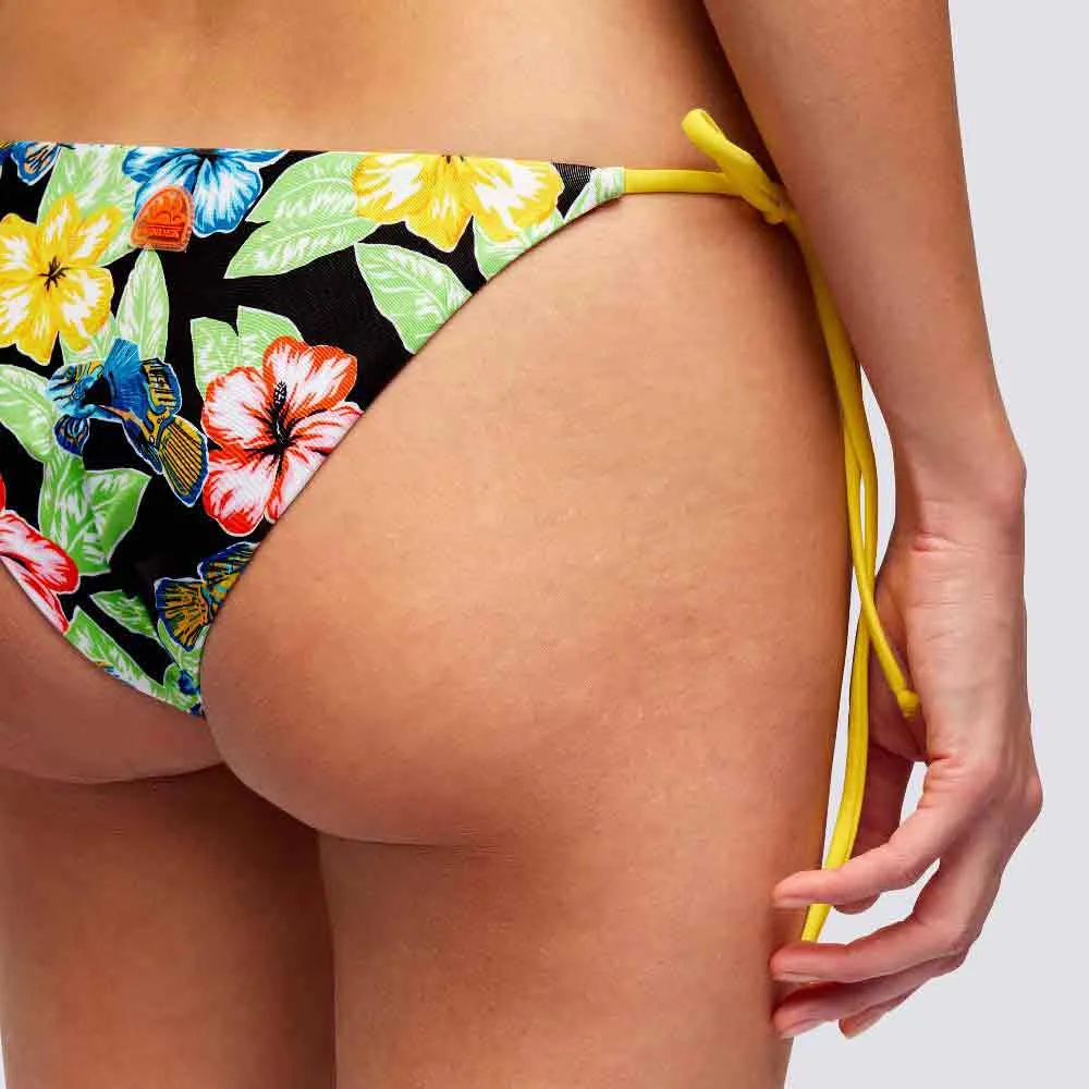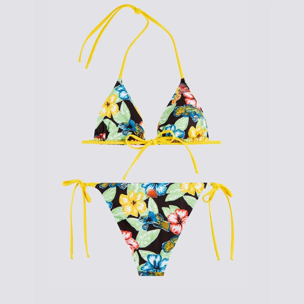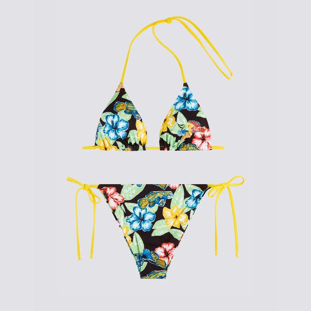 Бикини с треугольным верхом и регулируемыми завязками по бокам, с цветочным и красочным узором.