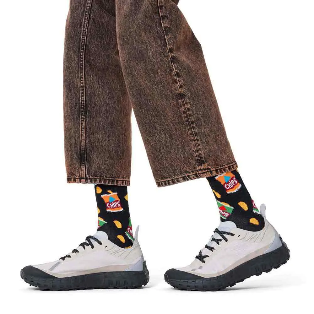 Ощутите стиль с нашими черными забавными носками с повторяющимся рисунком пакета чипсов, которые добавят пикантности повседневной обуви.