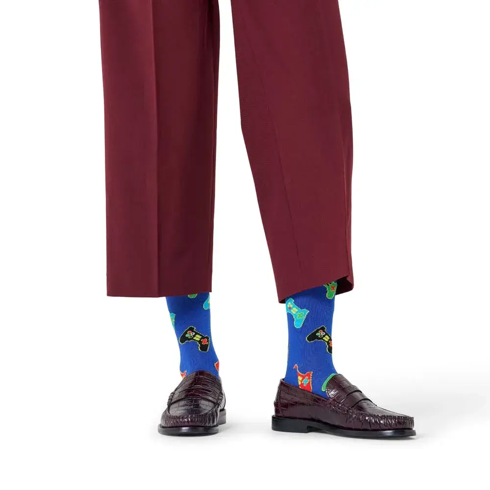Поднимите свой стиль на новый уровень с нашими веселыми игровыми носками смелого синего дизайна с красочными контроллерами.